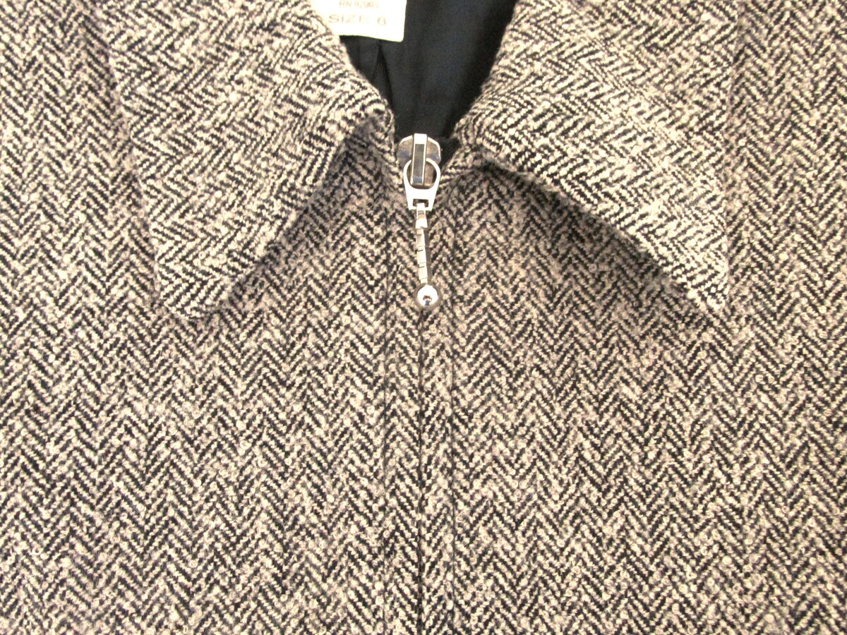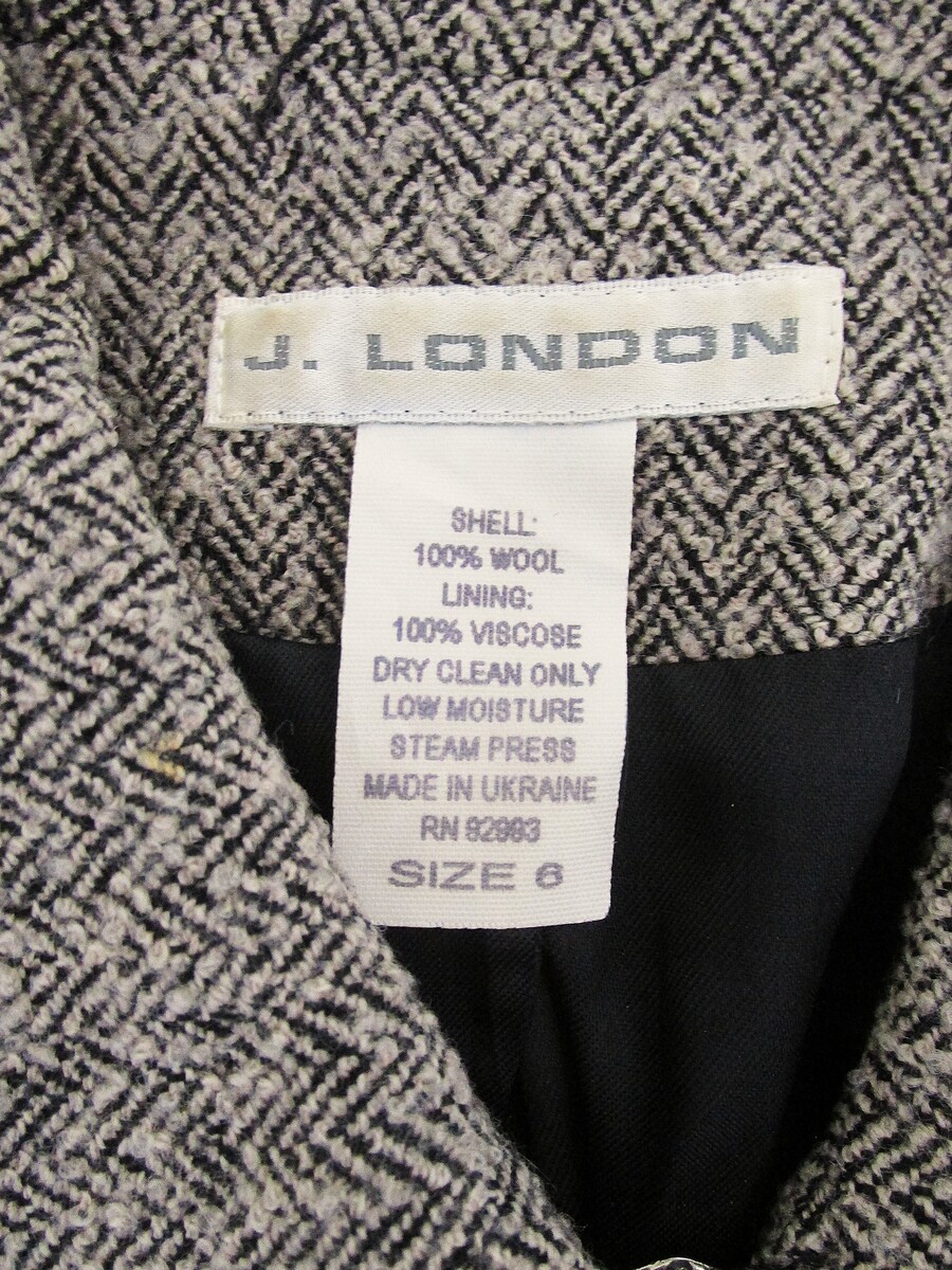 Description: Up for sale is a J. London women's wool jacket/blazer. This jacket is size 6. It is made of 100% wool fabric. It has a black ivory herringbone-like pattern. It has a full zipper front with 2 zipper front accent pockets. This jacket is in excellent condition but does have a spot on the sleeve which will come out when dry cleaned. Please see photo 7 9.