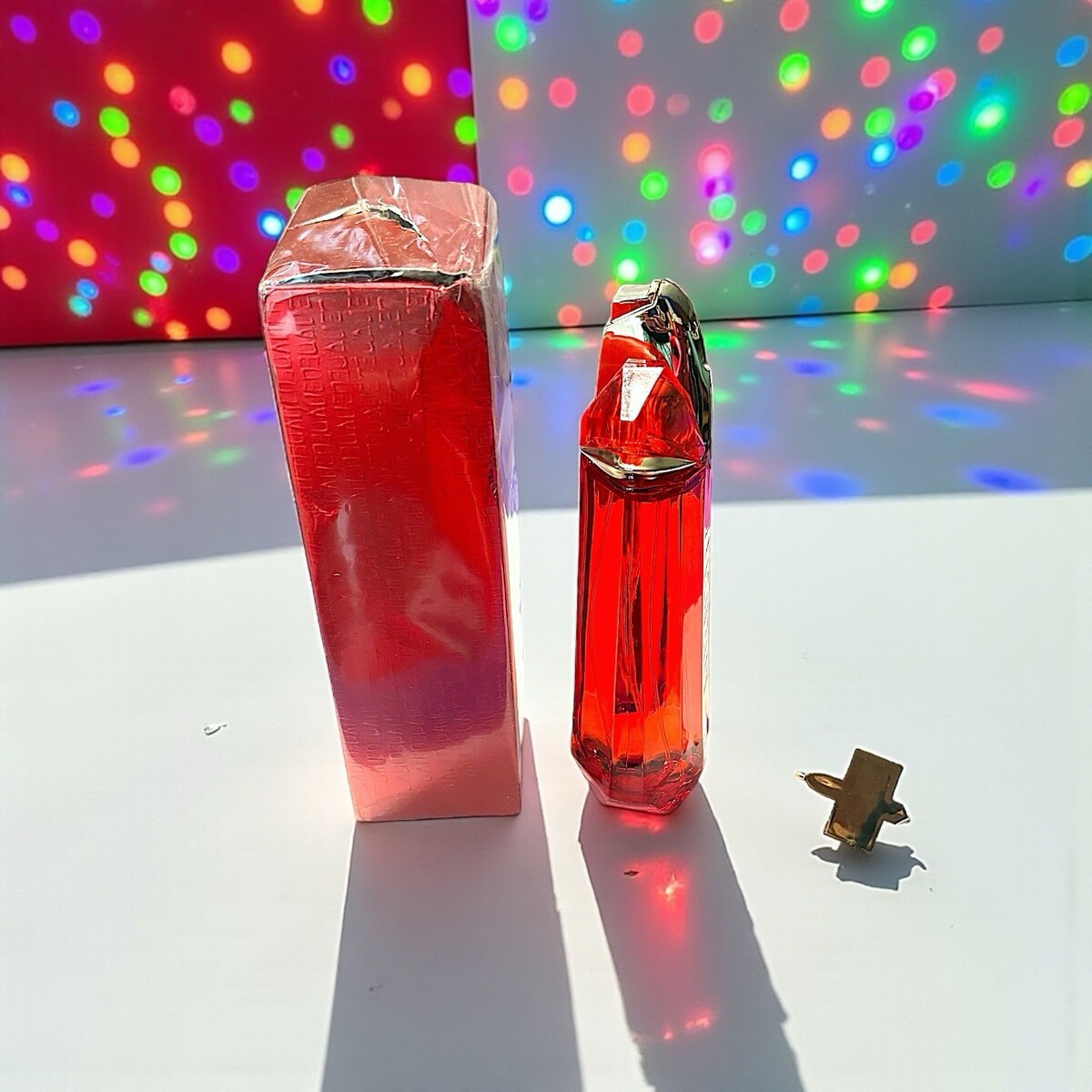 Despite outer packaging damage, this bottle remains full and functional. The gold decorative cap snapped at the hinge, but the sprayer works perfectly, and the perfume inside is untouched and smells exactly as it should.