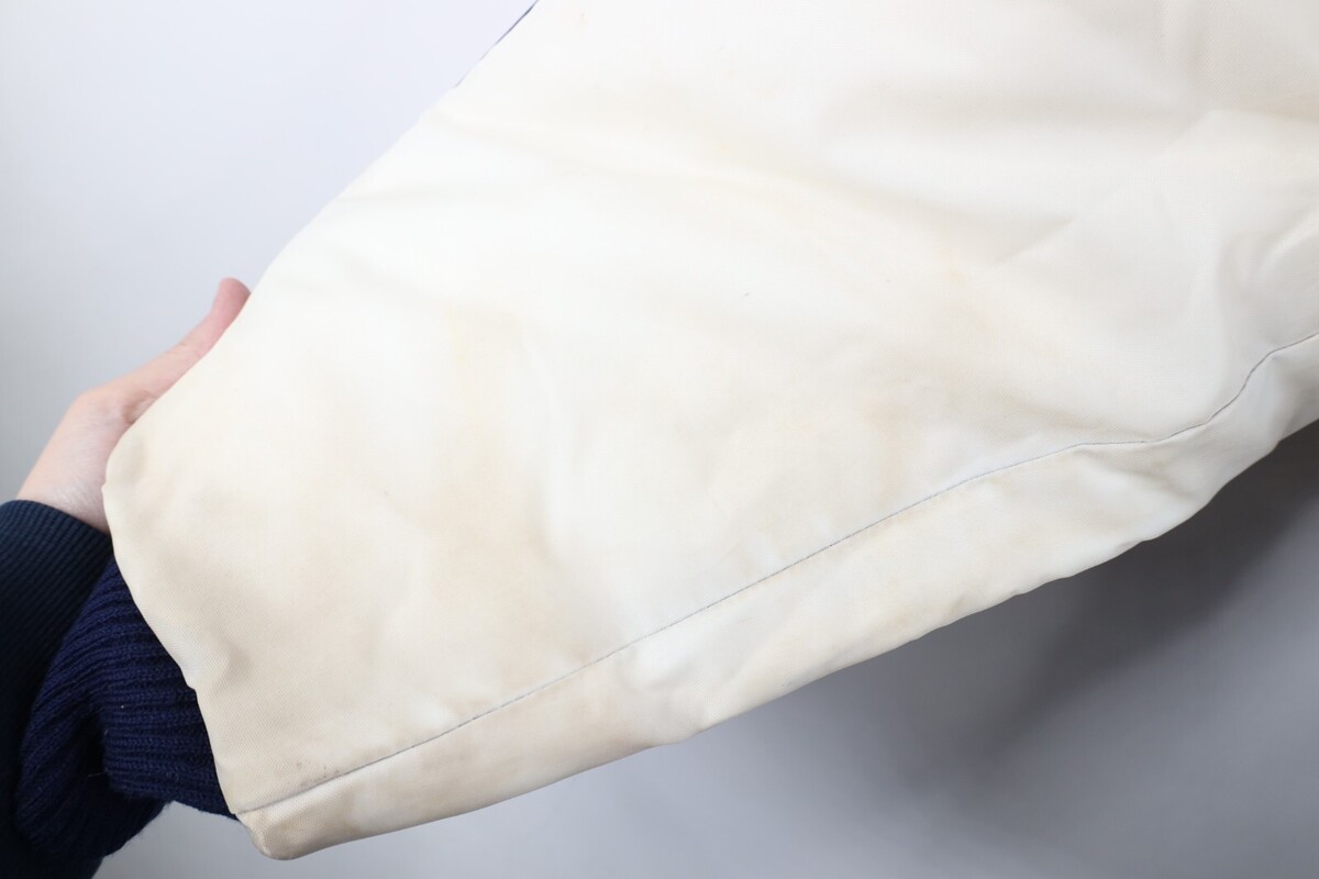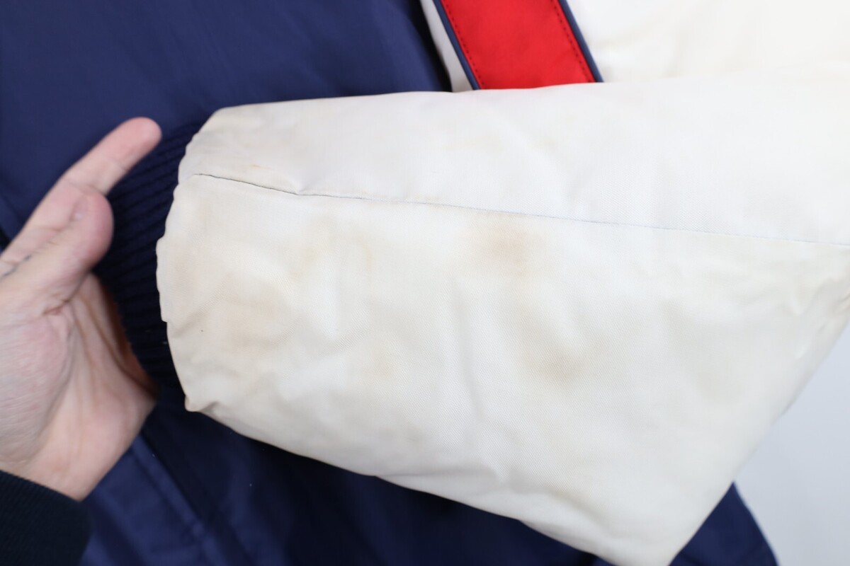 Stains collar, arms, cuffs. Stains, blemishes throughout. Loose threads cuffs, tag/front top, inner lining. Missing hood. Arms discolored. Cuffs pilled. Color faded