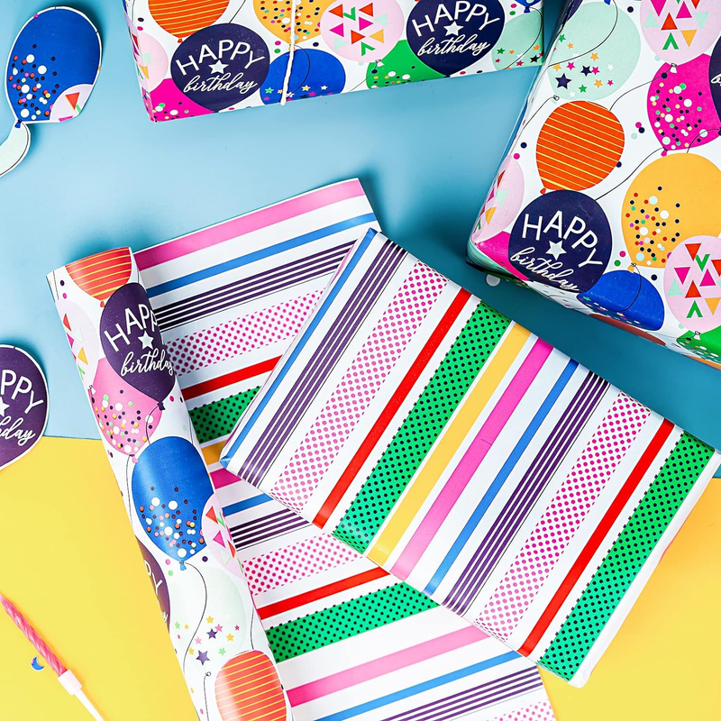 REVERSIBLE: Colorful balloons and confetti printed on one side, colorful stripes printed on the reverse. Two different designs make unique and varied gift presentations easy PERFECT SIZE: Each roll measures 17 inches wide by 33 feet long USE ALL OCCASION: Perfect for birthday, holiday, Christmas, wedding, Mother day, baby shower gifts wrap. It is also great for craft project