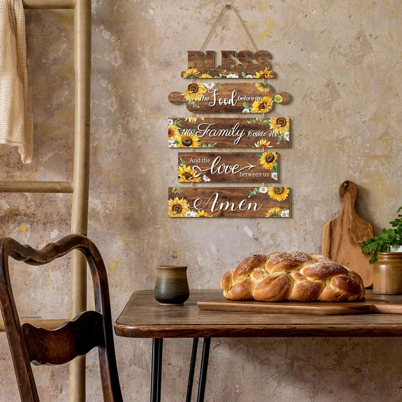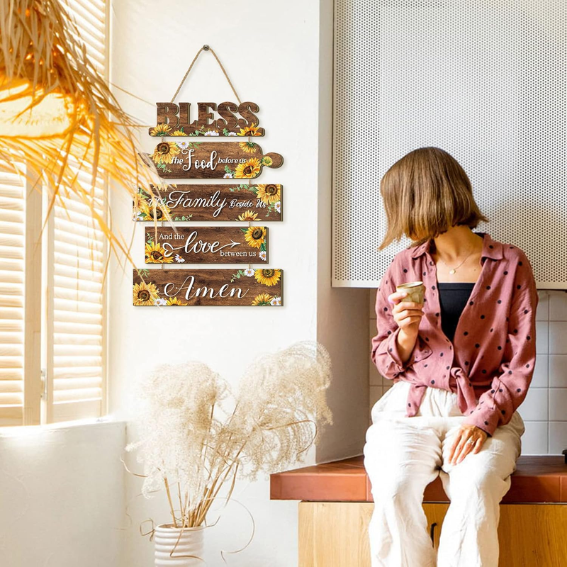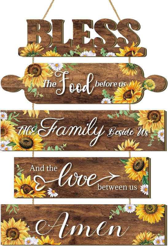 Farmhouse Style with Sunflower Patterns: this sunflower kitchen decors consists of 5 pieces of plaques that are strung together by a rope, each wood board is printed with different quotes: bless the food before us, the family beside us, and the love between us, amen. Together with sunflower patterns, dark brown and yellow colors, will bring you a nice visual enjoyment