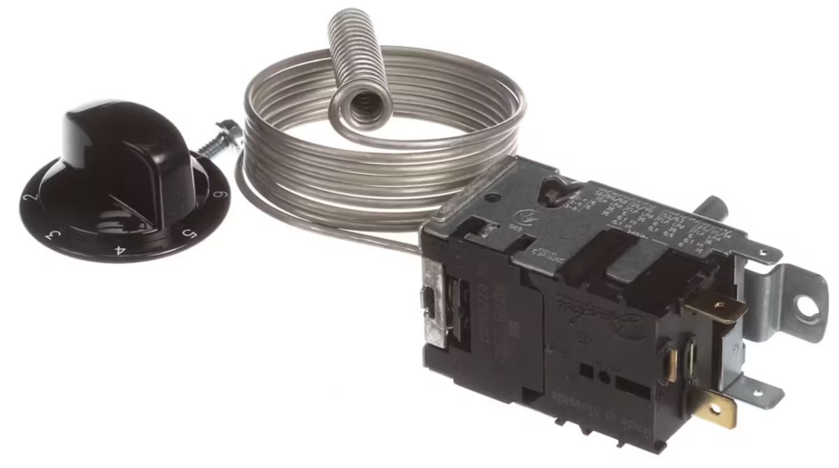 The Uline 077B3607 Thermostat with Knob is a genuine OEM temperature control unit designed for use in commercial refrigeration and freezer systems. Operating at 240V, this thermostat allows for precise manual temperature adjustment to maintain ideal storage conditions in Uline appliances and other compatible equipment.