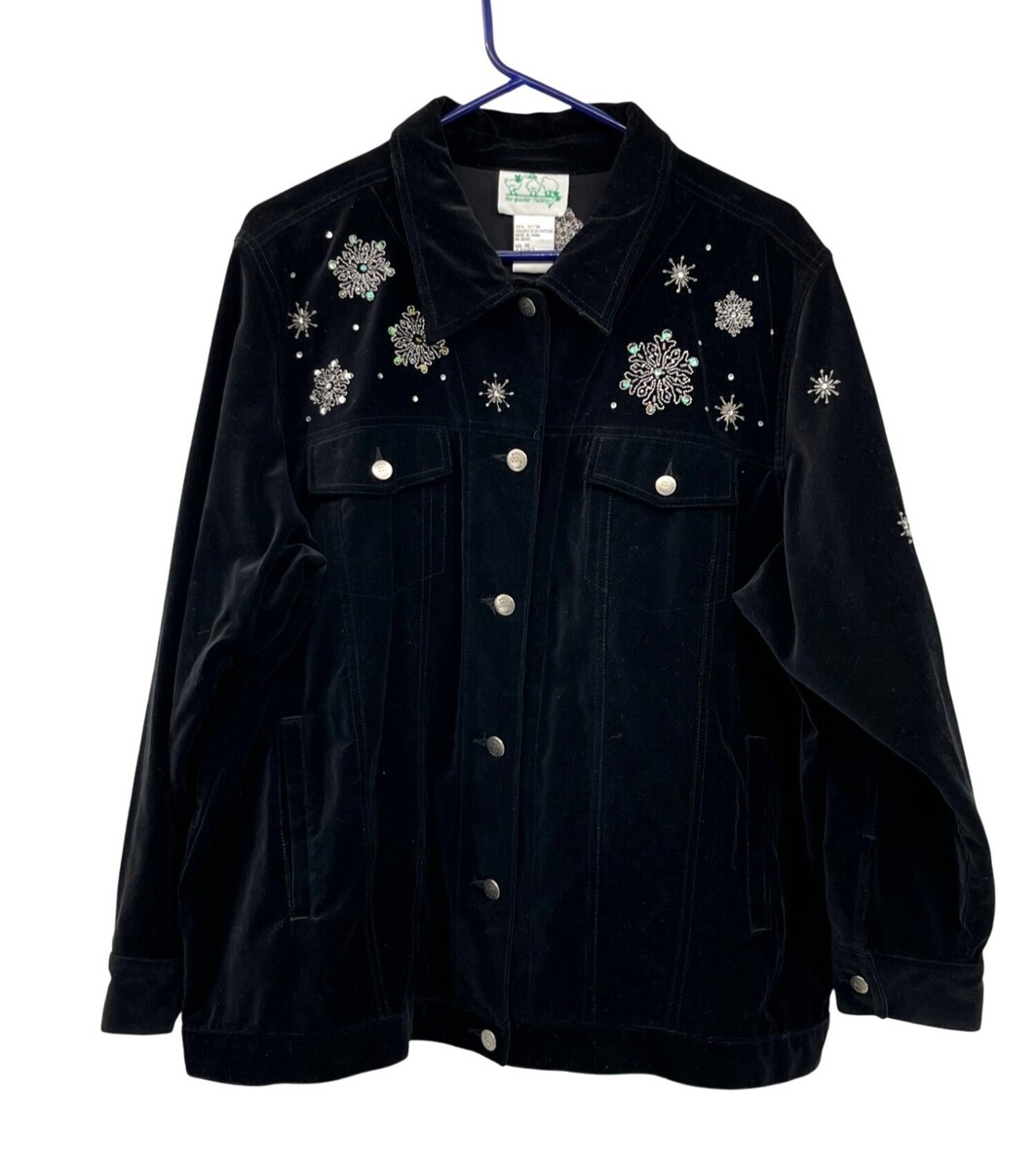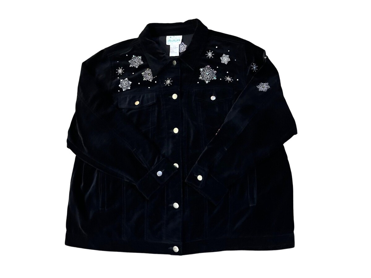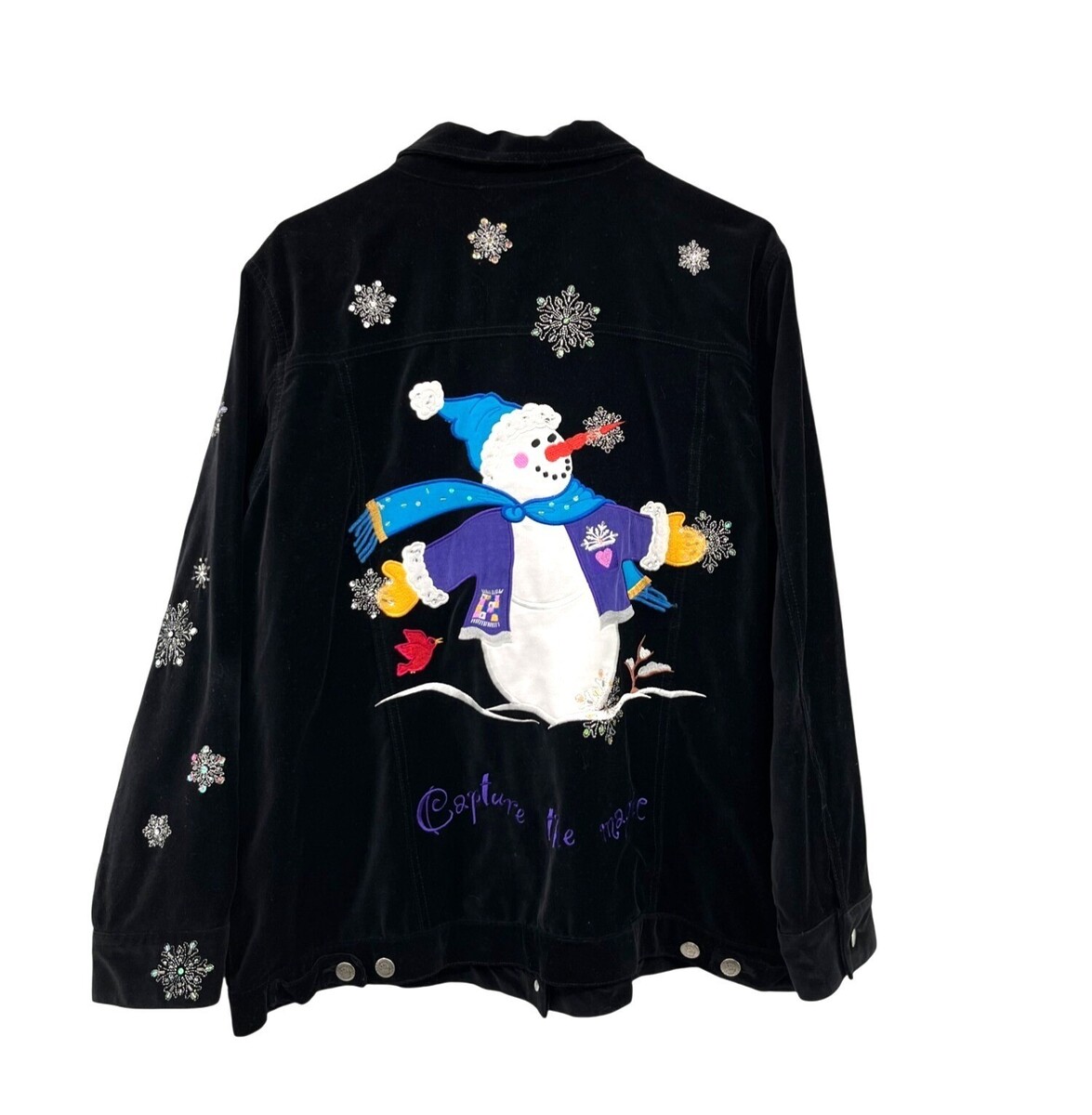 Quacker Factory, Holiday Jacket, Christmas, Snowman, Snowflakes, Embellished, Rhinestone, Festive, Jean Jacket Style, Velvet Feel, Women?s 1X, Winter, Capture the Magic, Holiday Party, Used