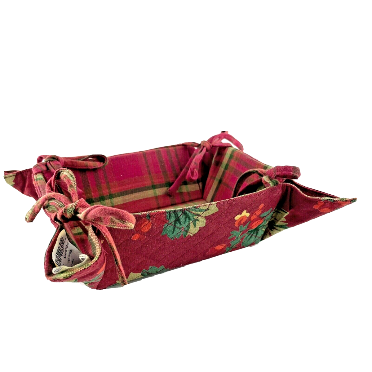 Fabric basket in Winterberry pattern in maroon. All four corners tie with a bow in the same material.