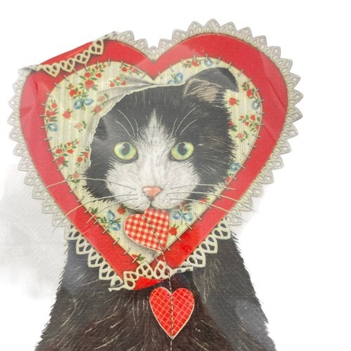 Features a black cat with white face and pink nose sporting a heart shaped doily around it's face. Scissors lay at its feet with paper hearts strewn about. Perfect for Valentine's Day.
