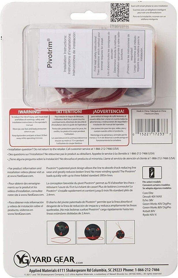 This trimmer head cuts with 6 pivoting lines to prevent breakage and is quick and easy to use. Premium pre-cut trimmer line is included.