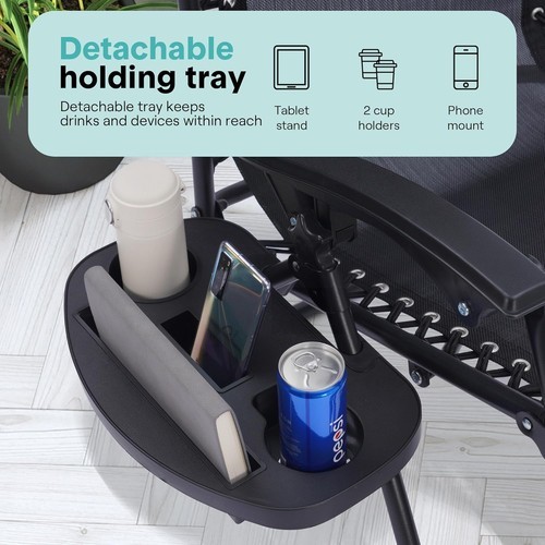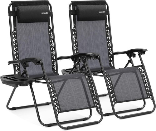 Upgrade your outdoor seating with the SereneLife Zero Gravity Lounge Chair Recliner 2-Pack in classic black. These foldable chairs are designed to simulate a weightless experience with their lockable zero-gravity function, allowing you to unwind in full-body comfort. Each recliner features a durable steel frame with double bungee cords and breathable Textilene mesh, ensuring strength, airflow, and long-lasting support. Enjoy added convenience with removable padded headrest pillows and detachable side tables that include built-in cup holders?perfect for holding drinks, snacks, phones, or books. The chairs are lightweight, weather-resistant, and fold flat for compact storage and portability, making them an excellent choice for patios, lawns, RVs, and campsites. Whether you're soaking up the sun, enjoying a quiet evening, or hosting friends outdoors, this SereneLife recliner set provides comfort and style for any outdoor space.