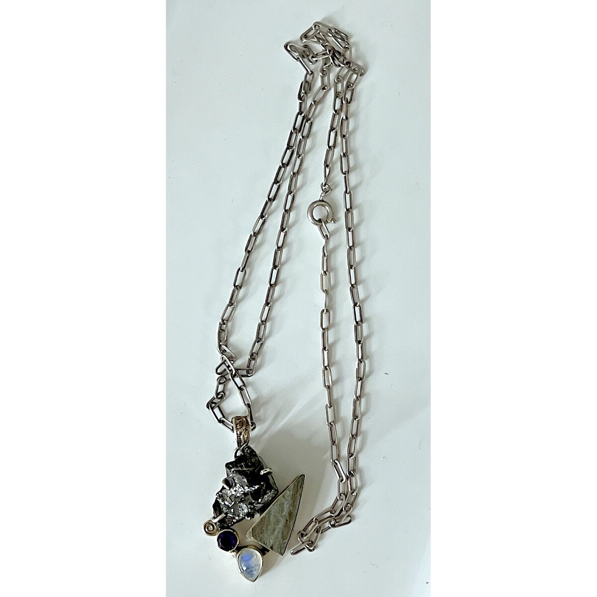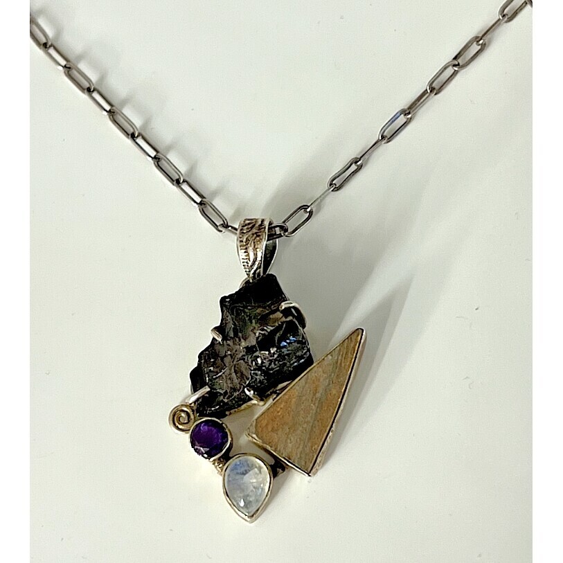 THE PENDANT SET WITH CHUNK OF HEMATITE, GREEN MARBLE, MOONSTONE AND AMETHYST.