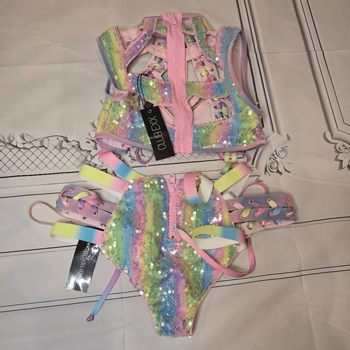 Dolls Kill Harness Rainbow Sequin Rave Festival Lace Up Top - M