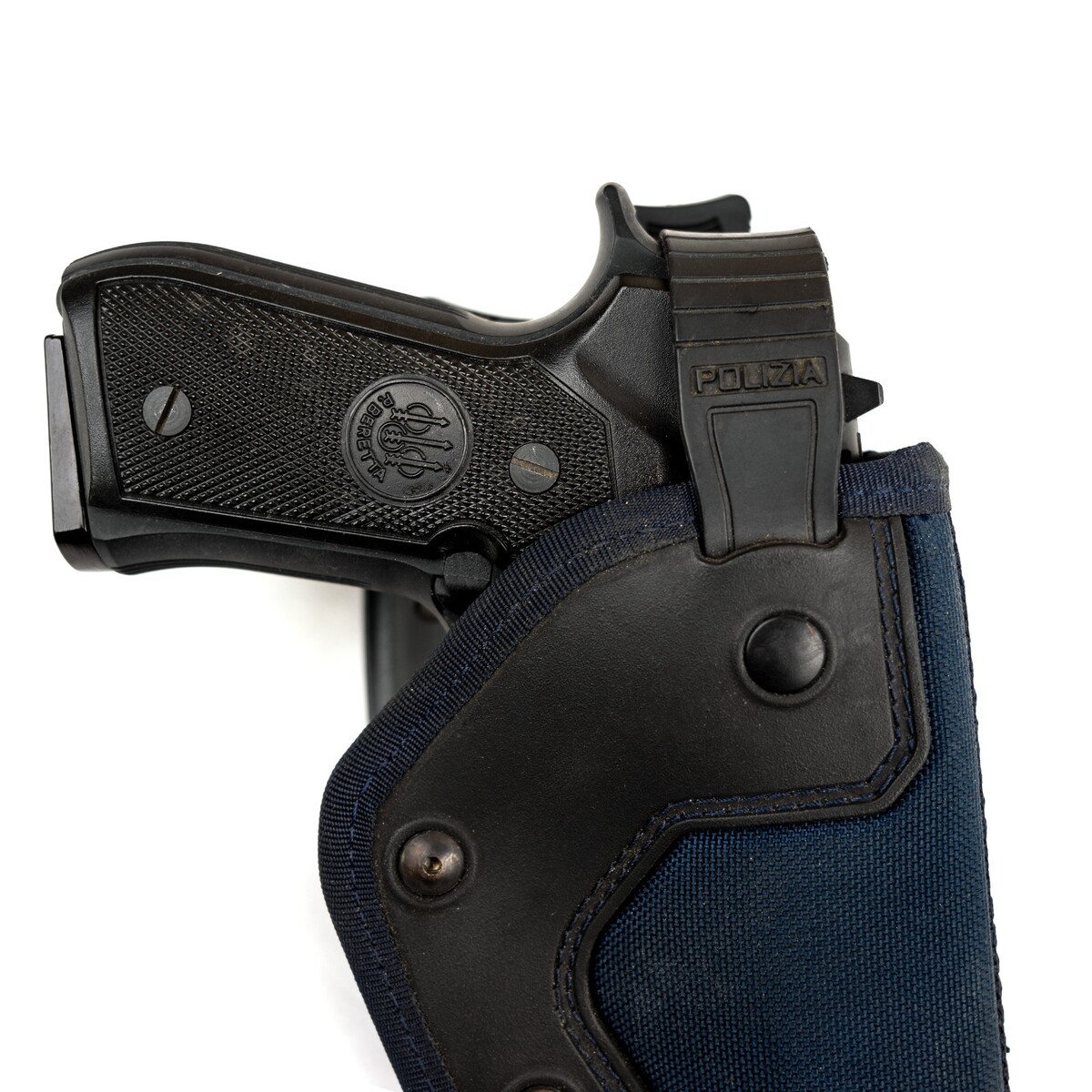 Authentic Italian Police-issued surplus holster designed for the Beretta 92FS, crafted to stringent government specifications for reliable duty use. Constructed with a rugged nylon canvas outer shell and molded plastic core, this Type II holster ensures secure weapon retention while featuring an adjustable belt loop for customizable cant and draw angle comfort. The included thumb-safety snap closure emblazoned with the iconic POLIZIA marking?verifies its official origin for the Italian national police force. Fully compatible with all Beretta 92-series models (92, 92FS, A1, and A3), it delivers tactical versatility for range practice or historical collection. As genuine surplus gear, it may exhibit minor wear from long-term storage, preserving its authentic service heritage without sacrificing functionality.