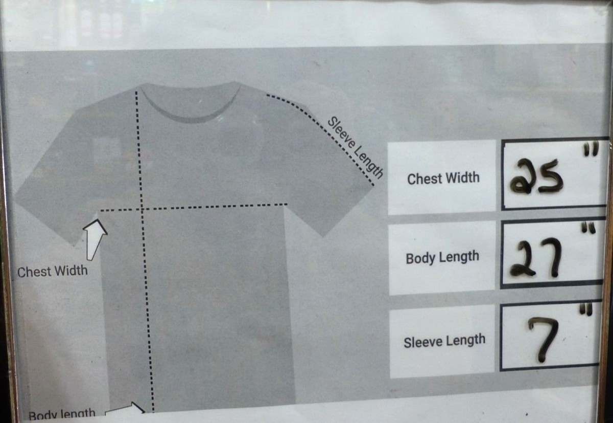 Chest width = 25 inches, Body length = 27 inches, Sleeve length = 7 inches