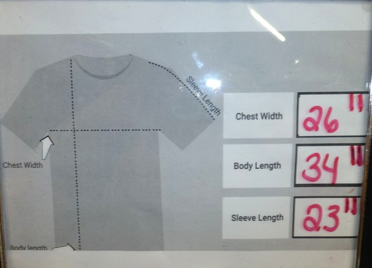Chest Width = 26 inches, Body Length = 34 inches, Sleeve Length = 23 inches.