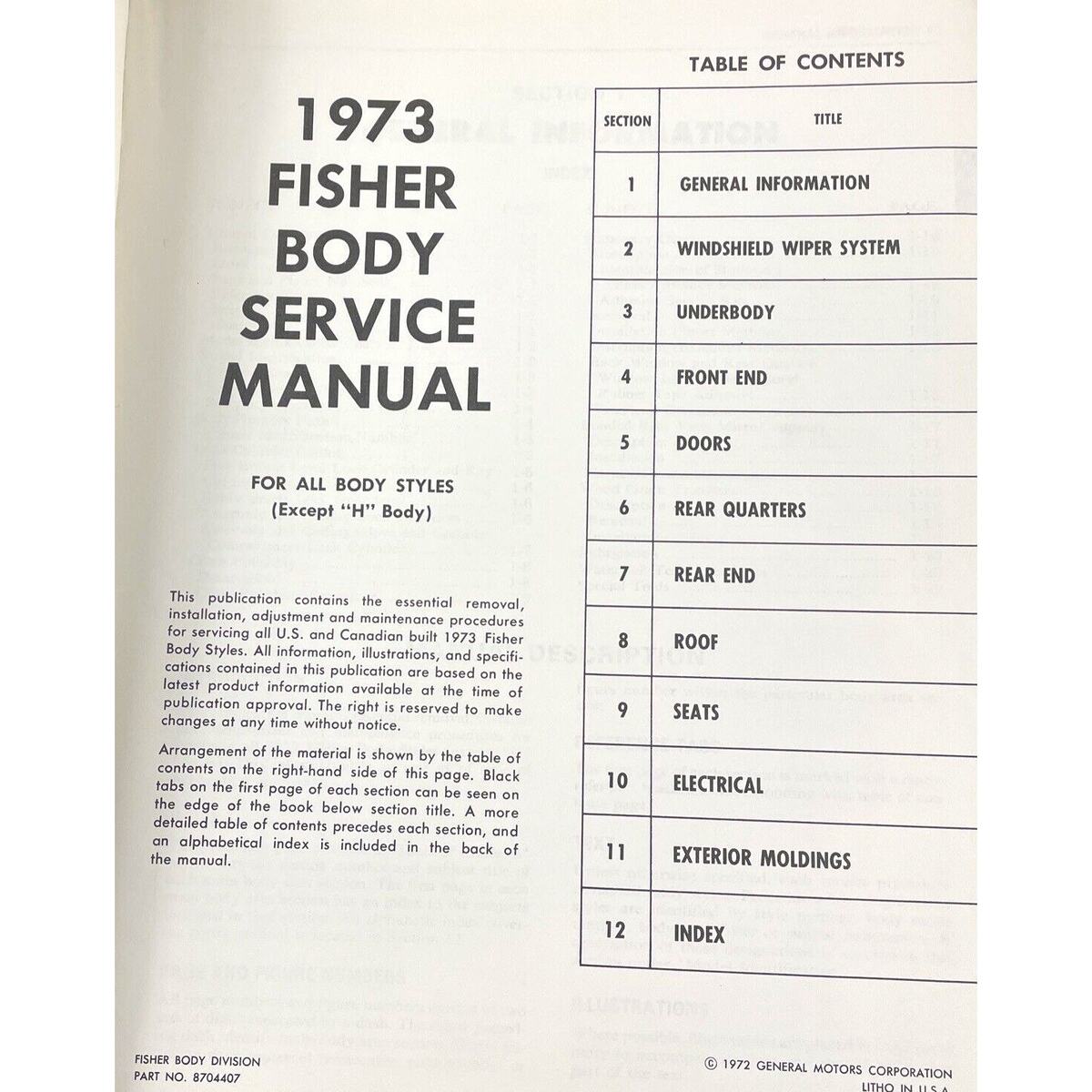 This 1973 Fisher Body Service Manual is an essential reference for automotive restoration and vehicle repair. It covers all GM body types from 1973, except the H Body, providing detailed service procedures, technical specifications, and maintenance instructions for bodywork, assembly, and repairs. This manual is ideal for classic car enthusiasts, GM vehicle owners, and restoration professionals looking for accurate, original documentation for their restoration projects. It serves as an invaluable resource for those interested in vintage car repair, ensuring authentic GM service methods.