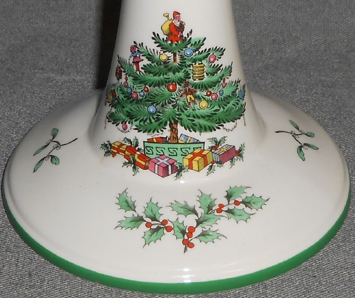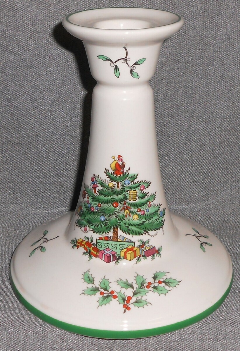 This is a Single Candlestick that measures approx 5 1/2" tall x approx 4 7/8" across at base from Spode in the Christmas Tree Pattern with the Green Trim. It is in great pre-owned condition with no chips or damage.