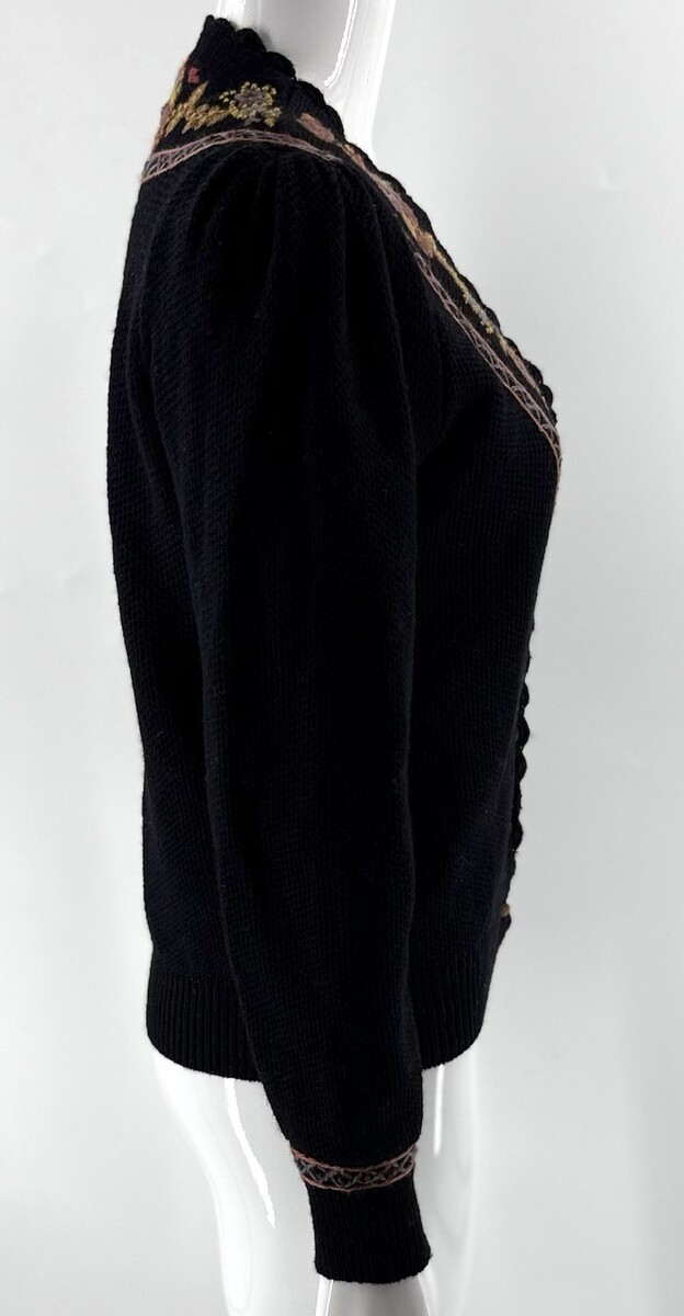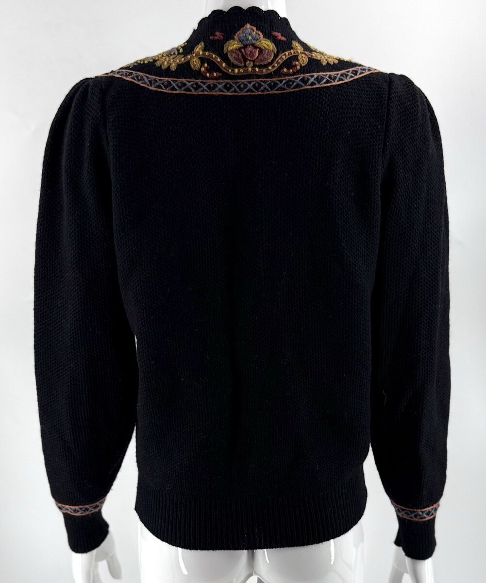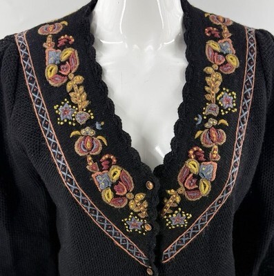 VTG Herman Geist Cardigan Sweater Size M Black Floral Embroidered Wool Blend