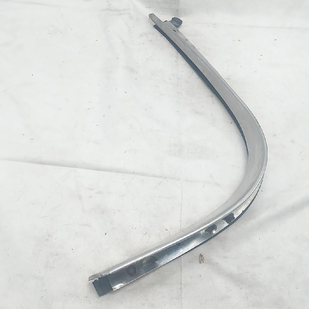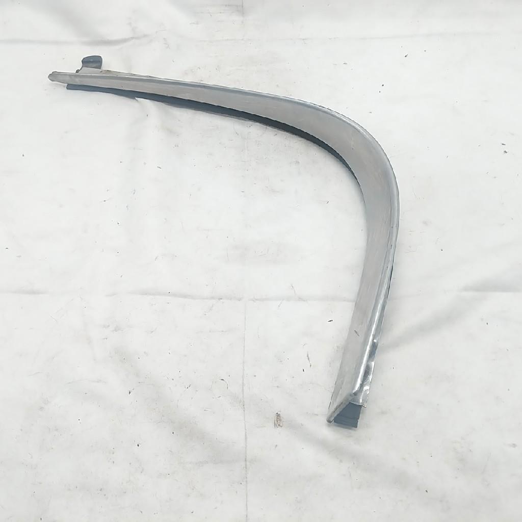The product is a vintage Pontiac 1969-72 Grand Prix left rear quarter window exterior stainless trim, made by GM in the United States. This silver trim features a glossy finish and easy installation with a clip-on attachment type, requiring no drilling. With a length of approximately 11", this quarter panel trim is designed specifically for the rear, left side of the vehicle, providing a classic and stylish look for restoration projects or custom modifications.