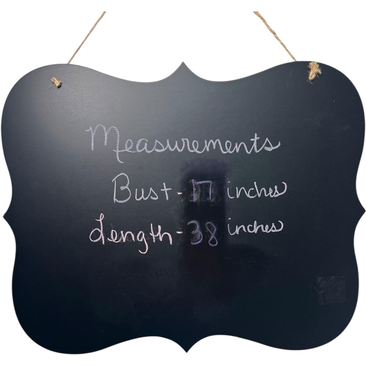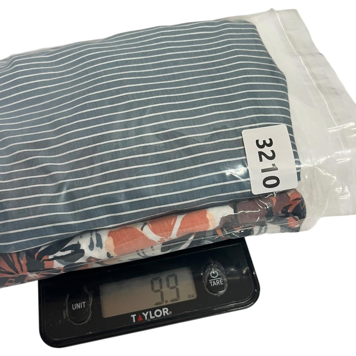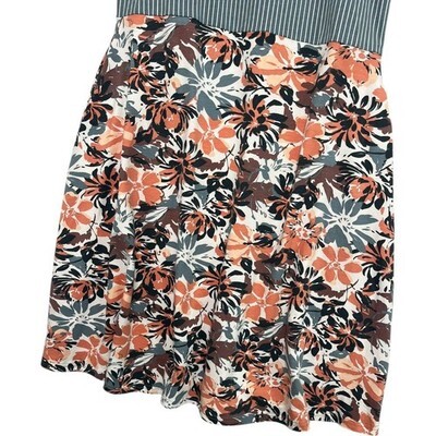 Color/Pattern: Blue-gray bodice with white pinstripes; multicolor floral skirt in coral/orange, black, gray, and white