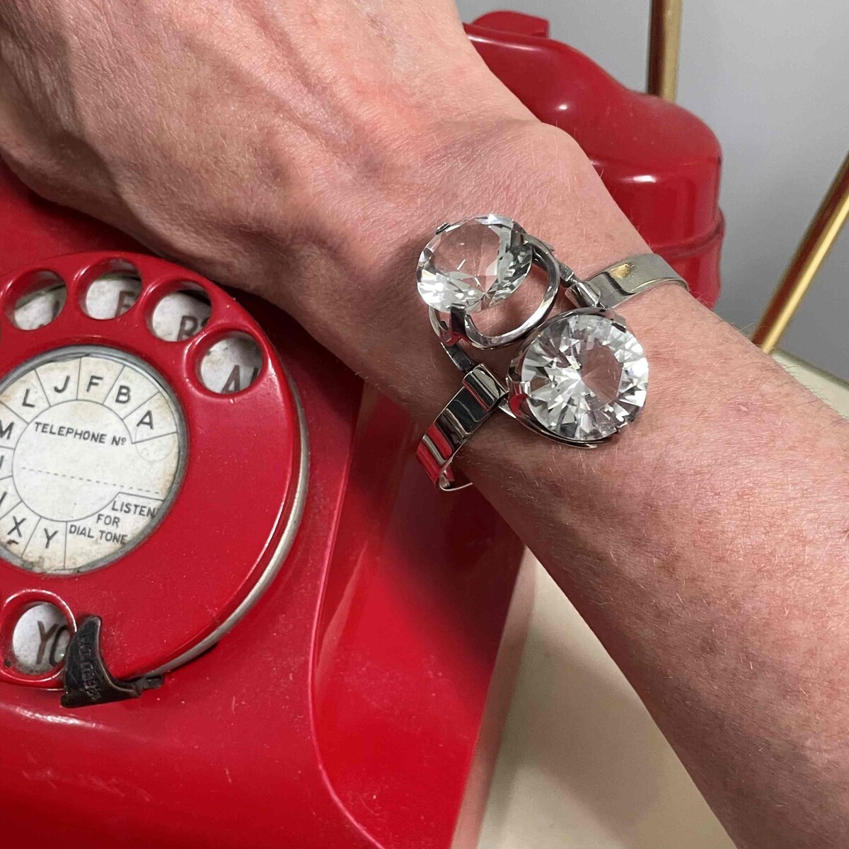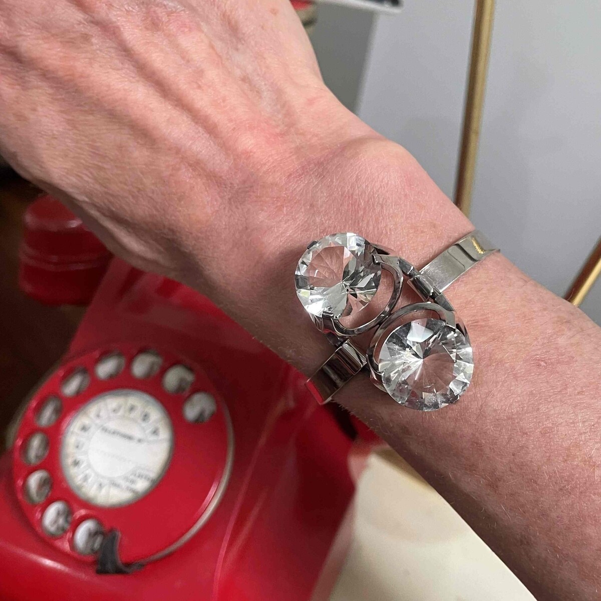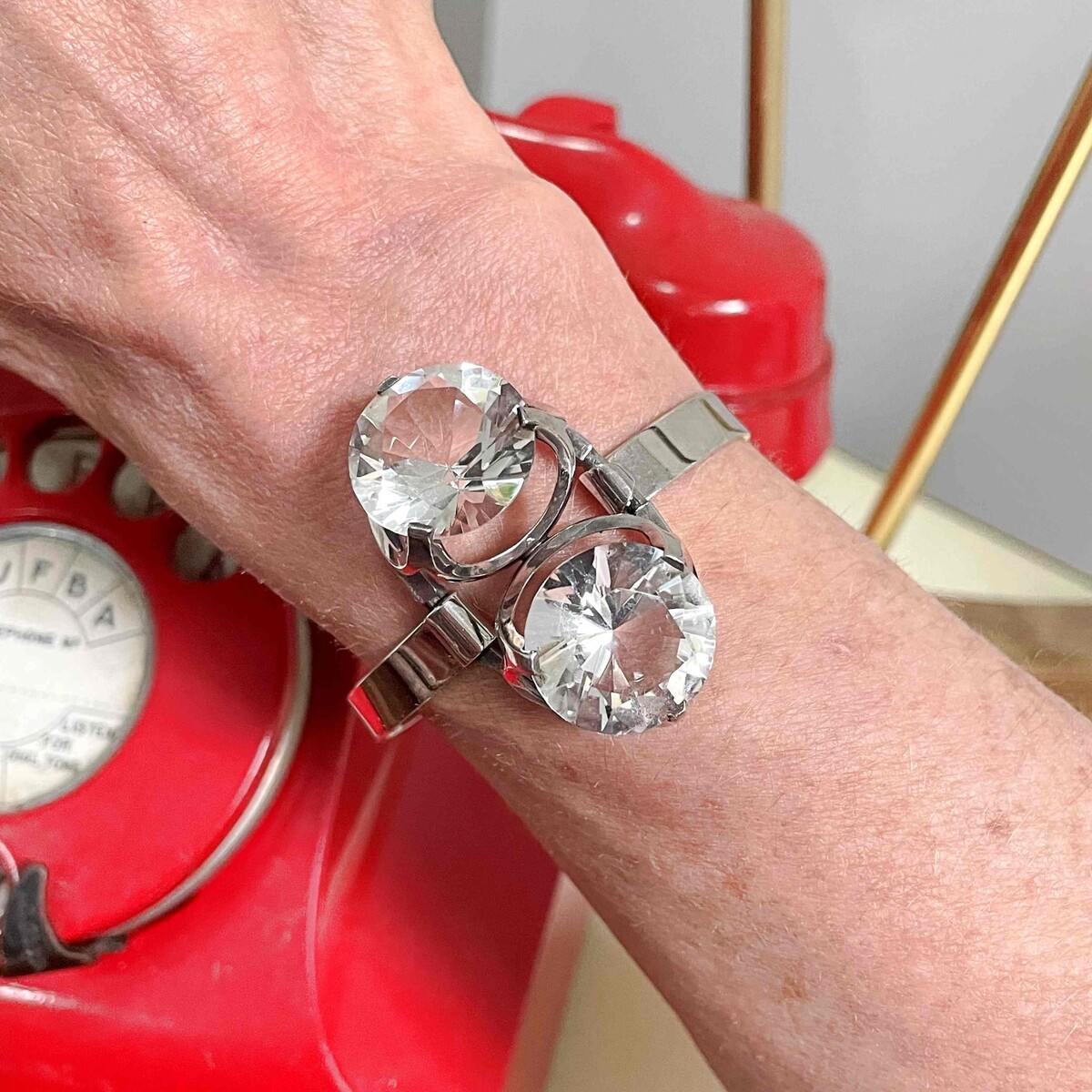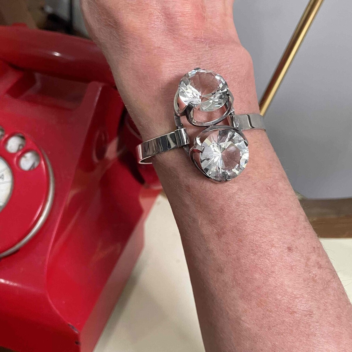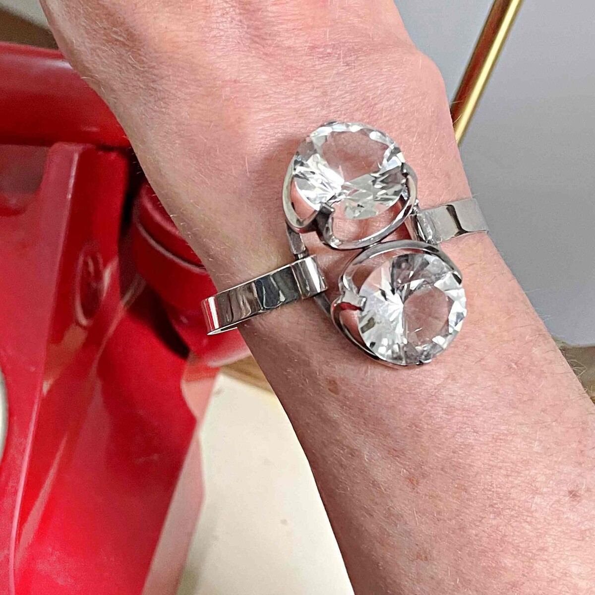 The bracelet is set with two large faceted round brilliant cut natural rock crystals of exceptional clarity and perfectly cut. Each of these big stones measures 11/16" in diameter and weighs 17 carats (17.8mm).