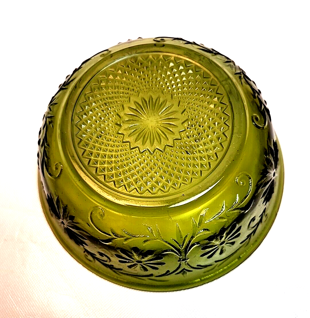 Mid-Century Avocado Green Candy Dish Round Glass Bowl Daisy Pattern FTD 1979