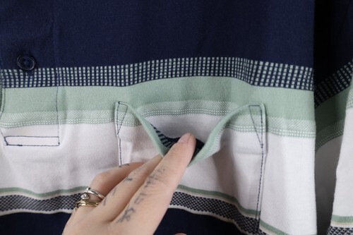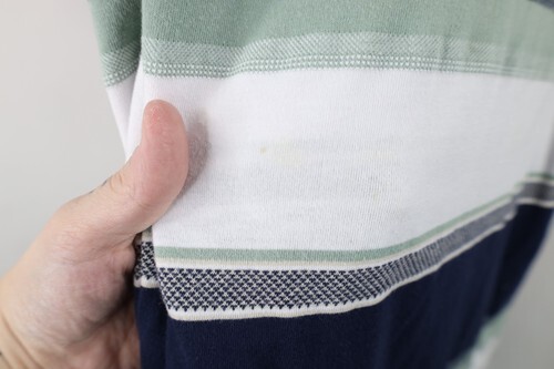 Blemishes front middle, bottom. Loose threads side slits. Collar, arms discolored. Color faded. Pilling