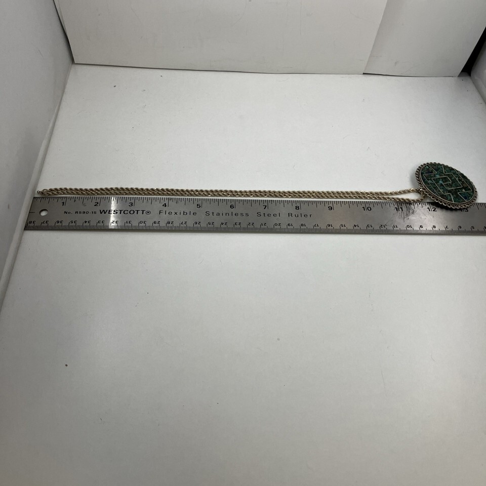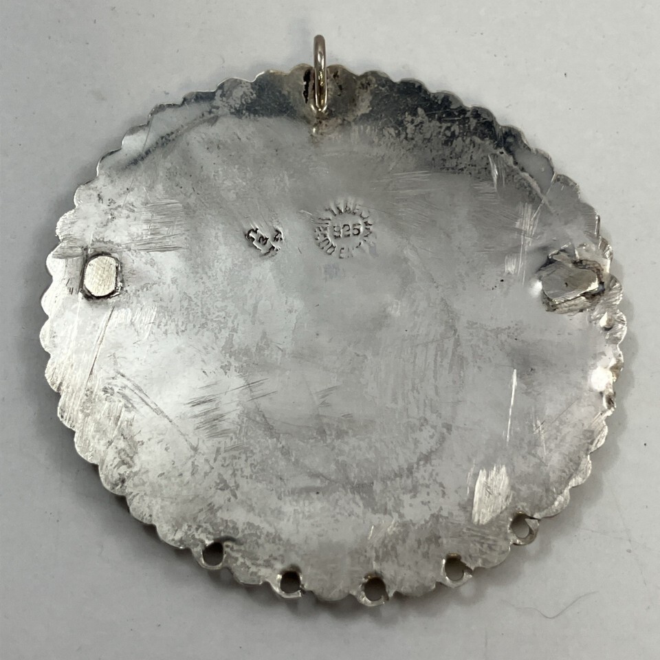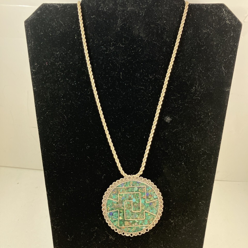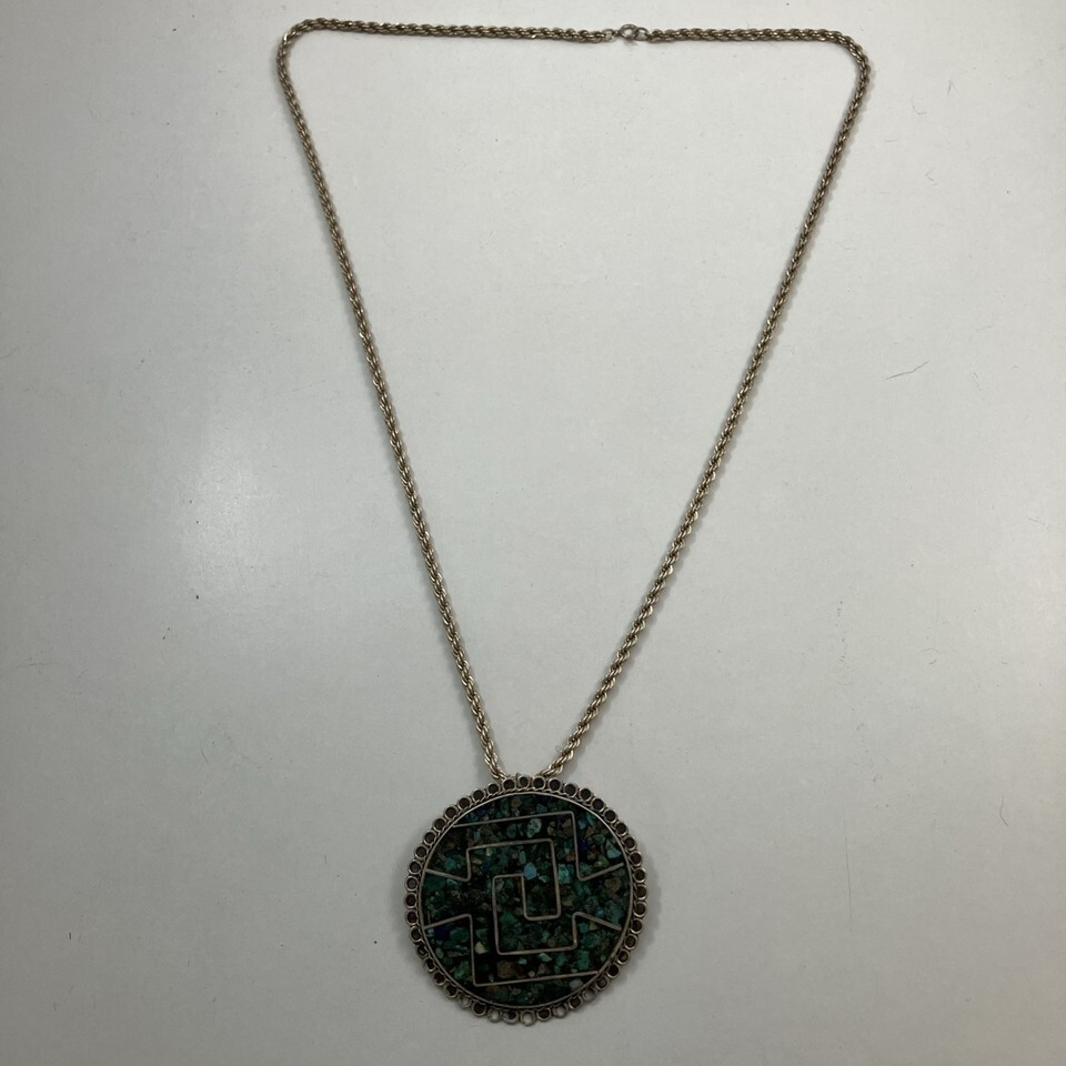 Sterling Silver Mexico Turquoise Inlay 2” Round Pendant & 24” 925 Necklace 34g