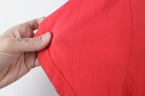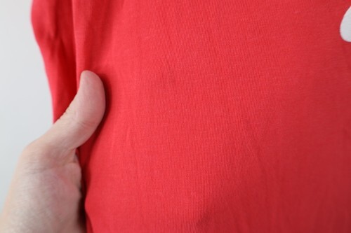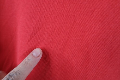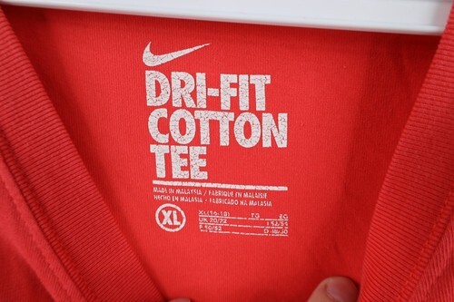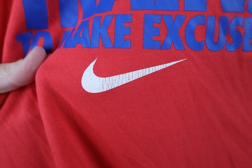 Stains/dark spots throughout. Collar, armpits discolored. Graphics cracking/faded. Color faded