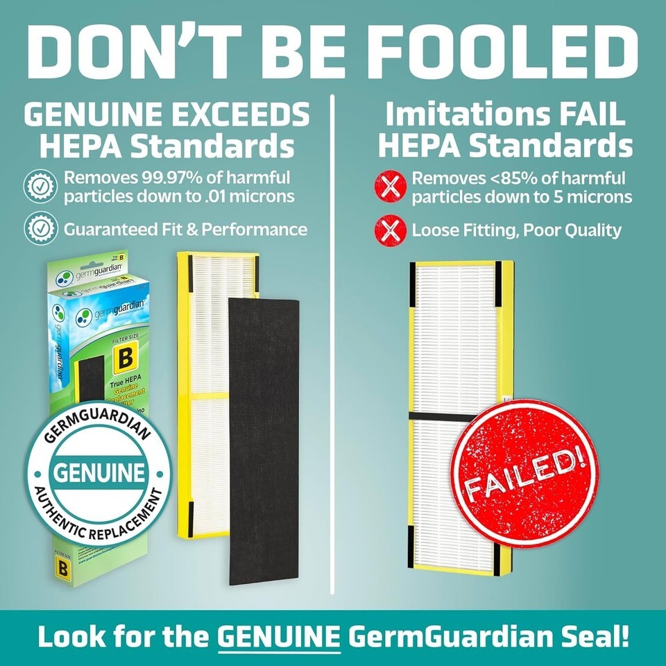 PURE PARTS, PURER AIR - Genuine Germ Guardian replacement filters guarantee certified fit and maximum filtration. Off-brand filters frequently fail HEPA testing standards, fit incorrectly, reduce efficacy, and may cause damage to your Germ Guardian air purifier. Your purifier is only as powerful and effective as the filter you put inside.
