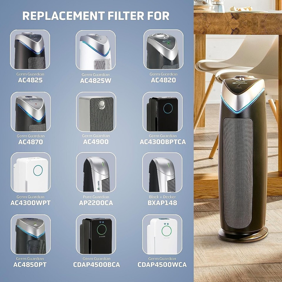 COMPATIBLE AIR PURIFIER MODELS: Replacement filter for GermGuardian Air Purifier Models AC4825E, AC4825W, AC4870, AC4820, AC4300BPTCA, AC4300WPT, AC4900CA, AC4850PT, CDAP4500BCA, CDAP4500WCA, PureGuardian Model AP2200CA and Black plus Decker BXAP150.