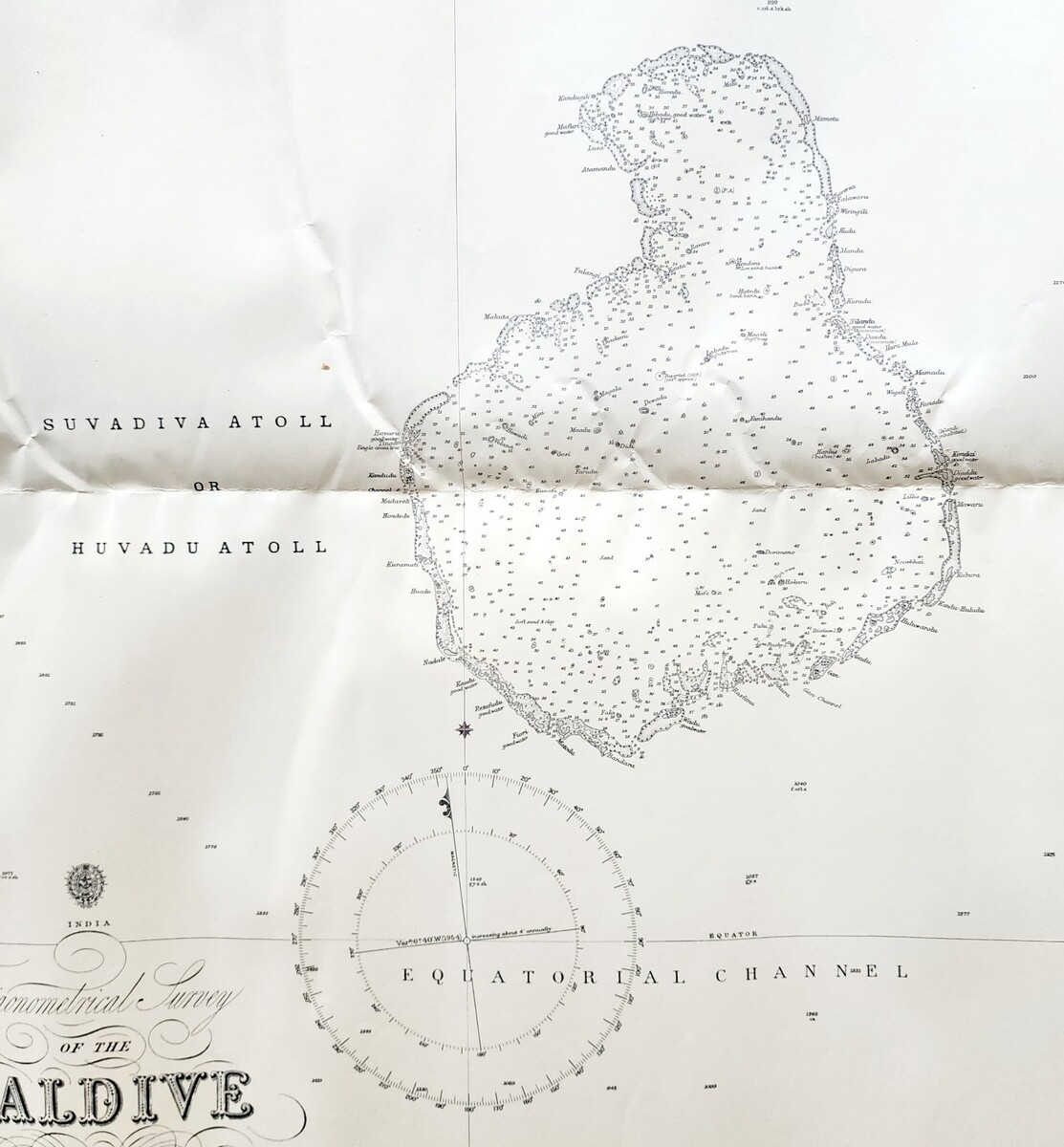 1963 Nautical Ship Map Maldive Islands Trig Survey 44"x28" Sailing Vintage MAPS