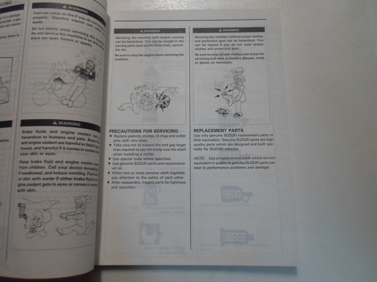 Full of information and illustrations, covers everything, step by step instructions, assembly/dis-assembly, exploded illustrations/diagrams/troubleshooting, great manual to have when owning/servicing a SUZUKI and will be a great aid to keep your SUZUKI on the road. This manual will save you money in repairs/service. A must have if you own one of these vehicles.