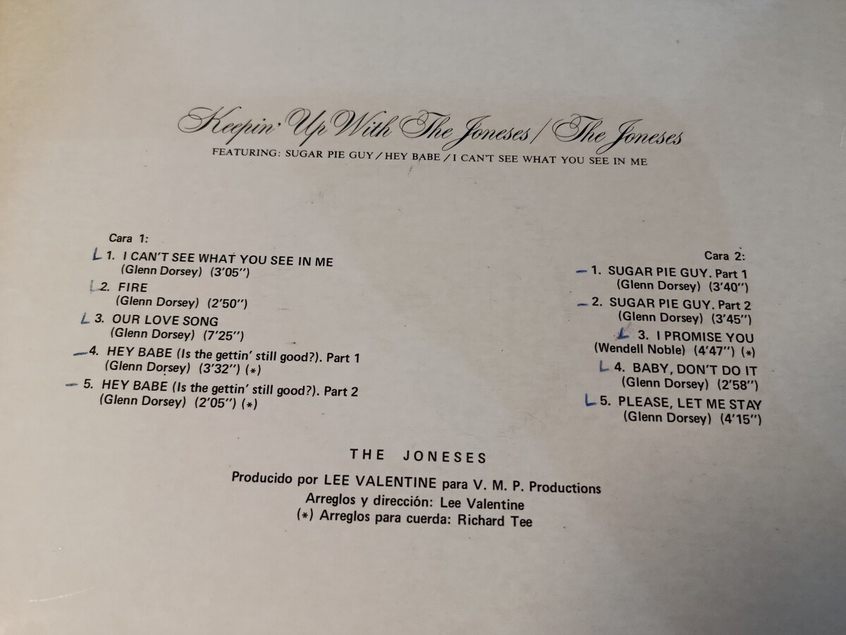Original Spanish edition del classic de The Joneses, published by Mercury Records In 1975. Includes el Sugar Pie Guy, uno delosgrandes topicsdel soul-funkde middelos 70. Produced by Lee Valentine and con orchestral arrangements de Richard Tee, this LP combines smooth de rhythms, harmonious vocal sections and refined instrumentation.