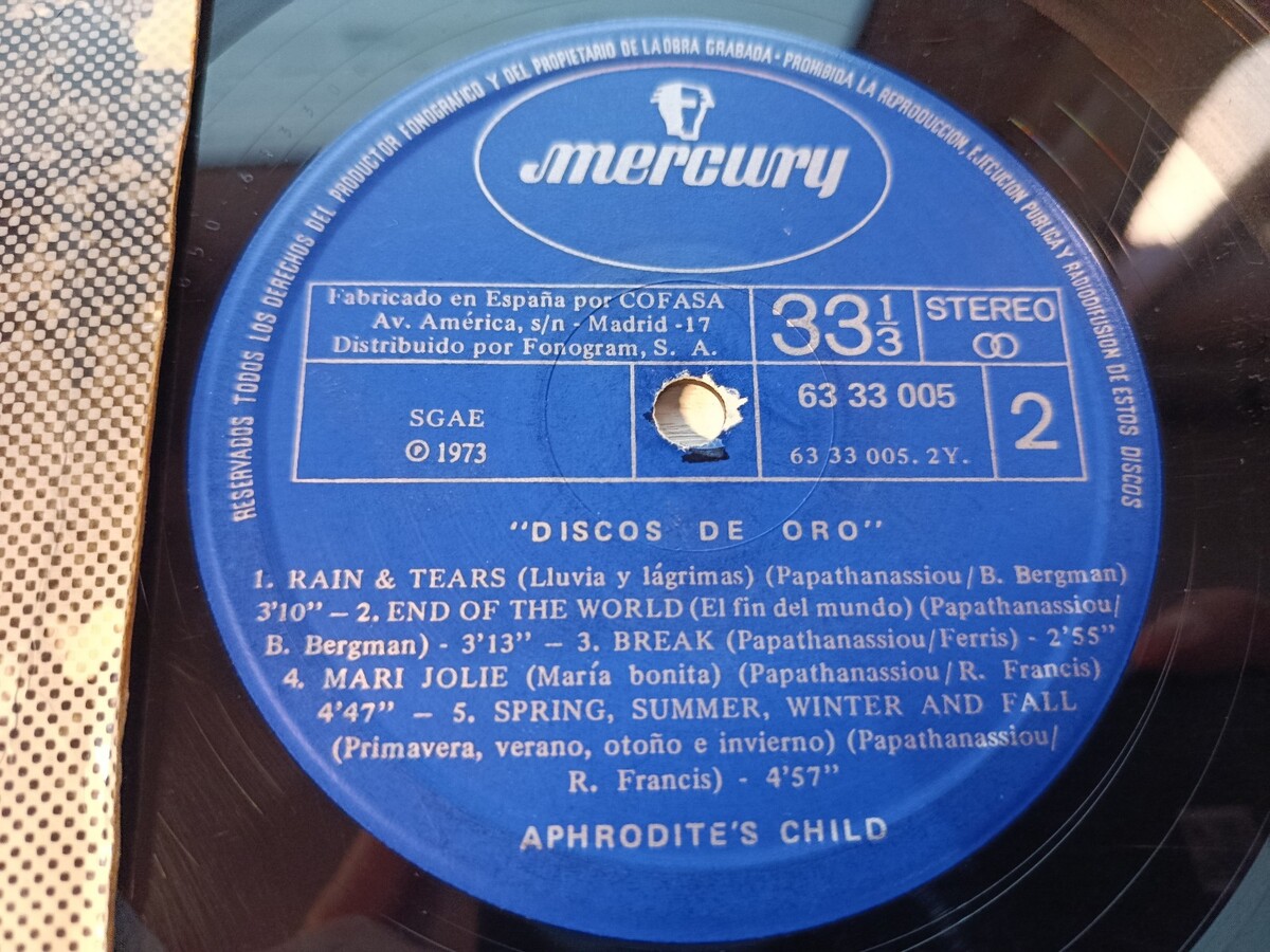 Aphrodite's Child, de Record, Mercury 1973, VANGELIS , Demis Roussos, progressive rock, psychedelia, Rain Tears, End of the World, It's Five O'Clock,vinyl 12 inches, vintage collection, COFASA Spain, 70s