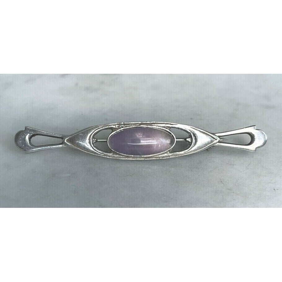 SIZE:APPROX.2 1/4'' x 3/8''.THE BROOCH FEATURES NATURAL AMETHYST CABOCHON.MARKED ILLEGIBELY,TESTED FOR SOLID 925 STERLING SILVER.