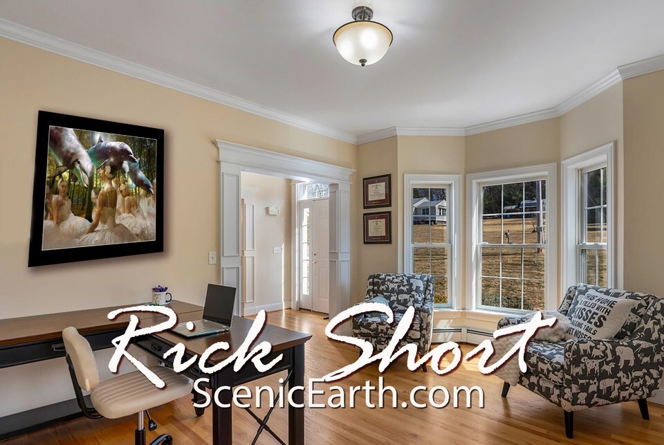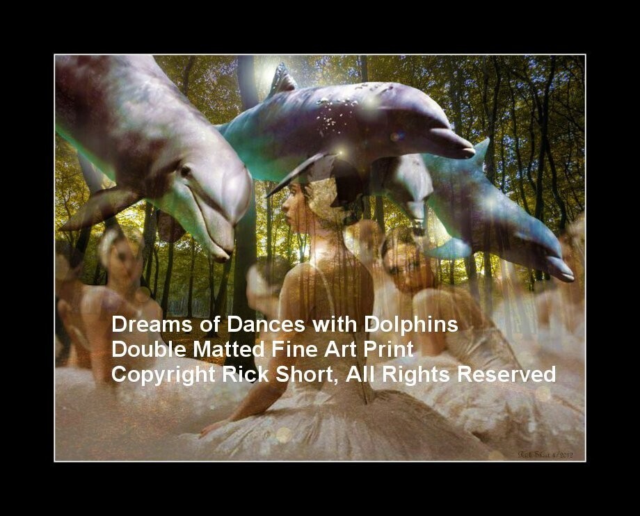 Dreams of Dances with Dolphins - an 11"x14" matted fine art digital painting by Artist Rick Short of Ballerinas dancing with Dolphins in a wooded forest. Surrealistic fine art print that is dream like in quality, soothing and imaginative of Marine life and women dancing together with nature and in harmony.