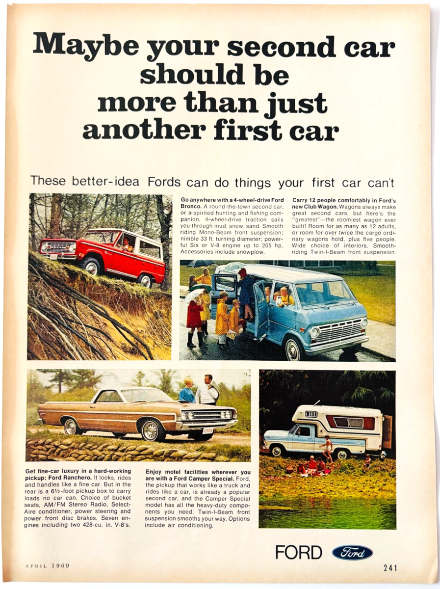 1969 Ford Motors Advertisement Vintage Ranchero Bronco Club Wagon Camper DWW10C