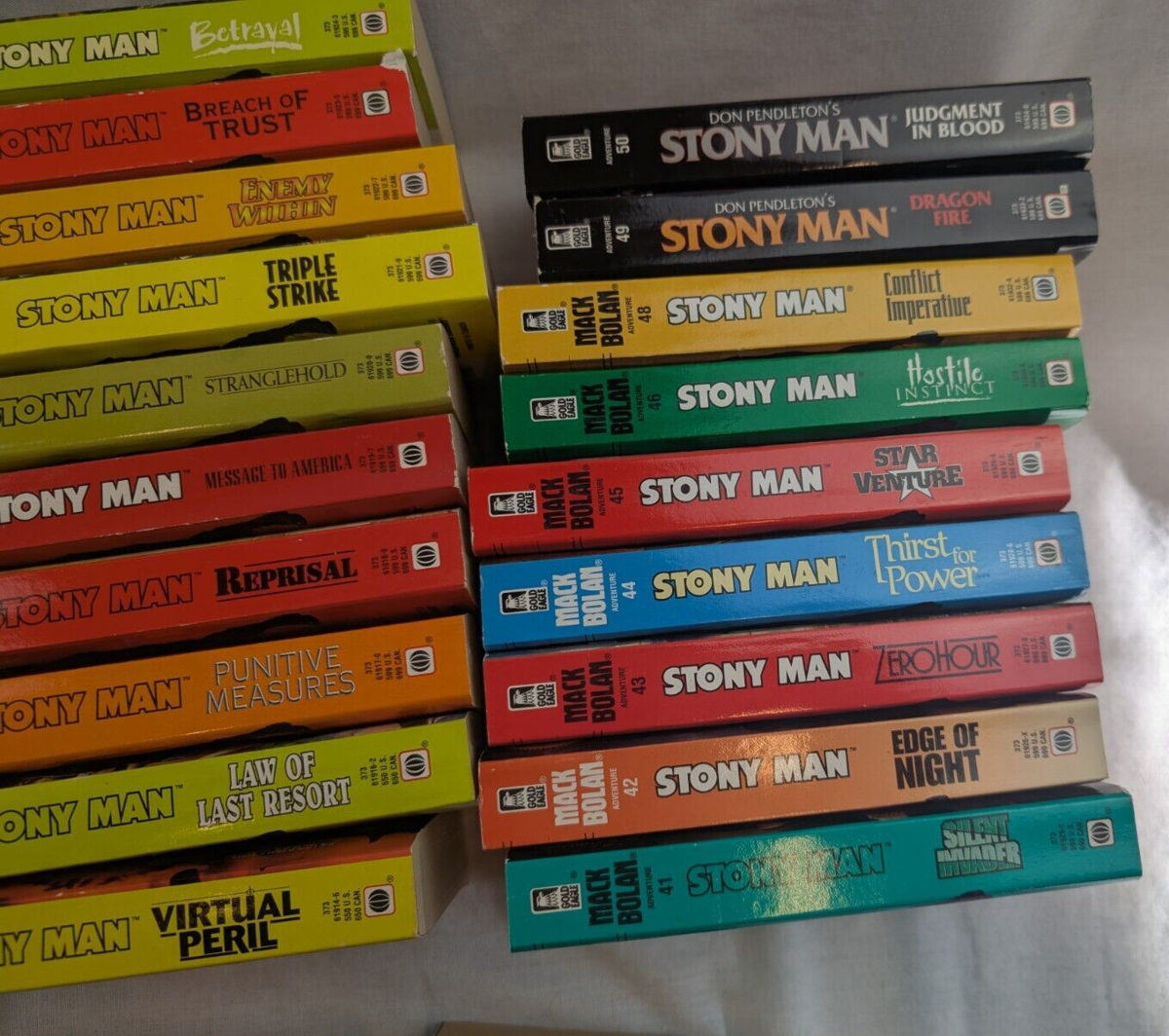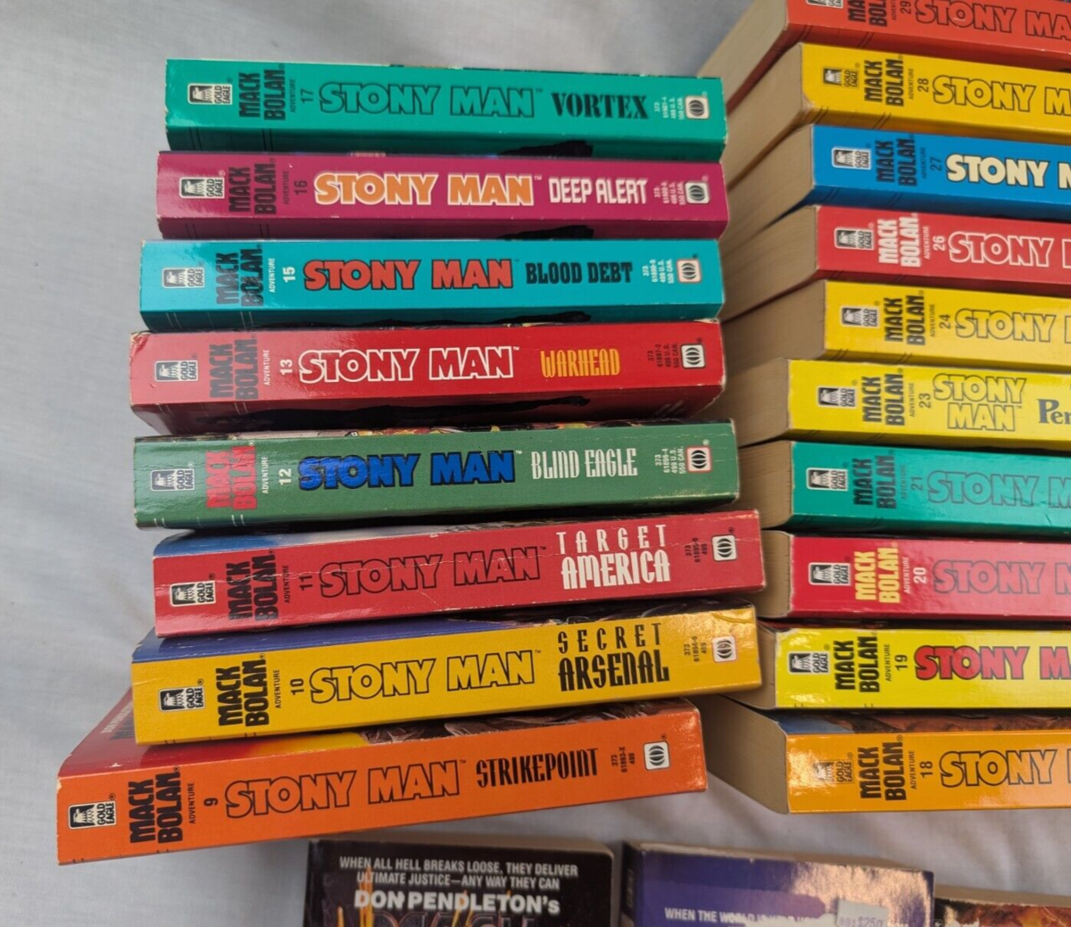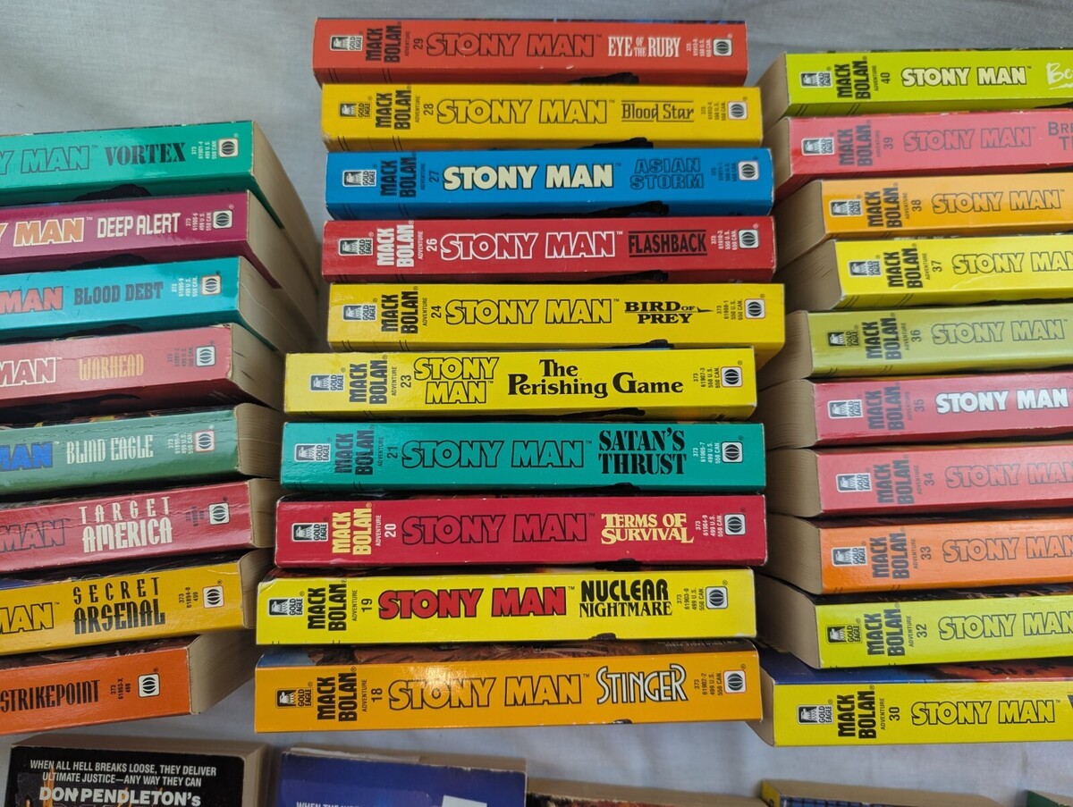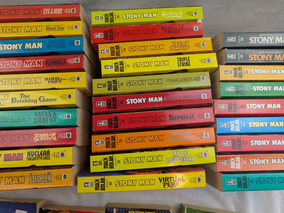 Up for sale is a Lot of 42 paperback books by Mack Bolan-- Don Pendletons' STONY MAN Series