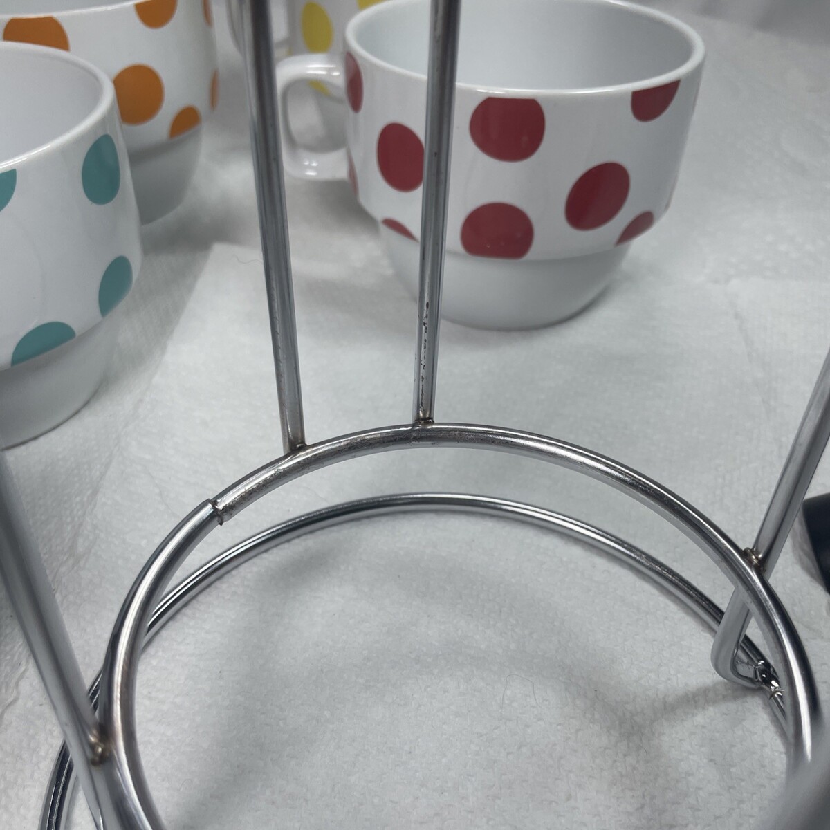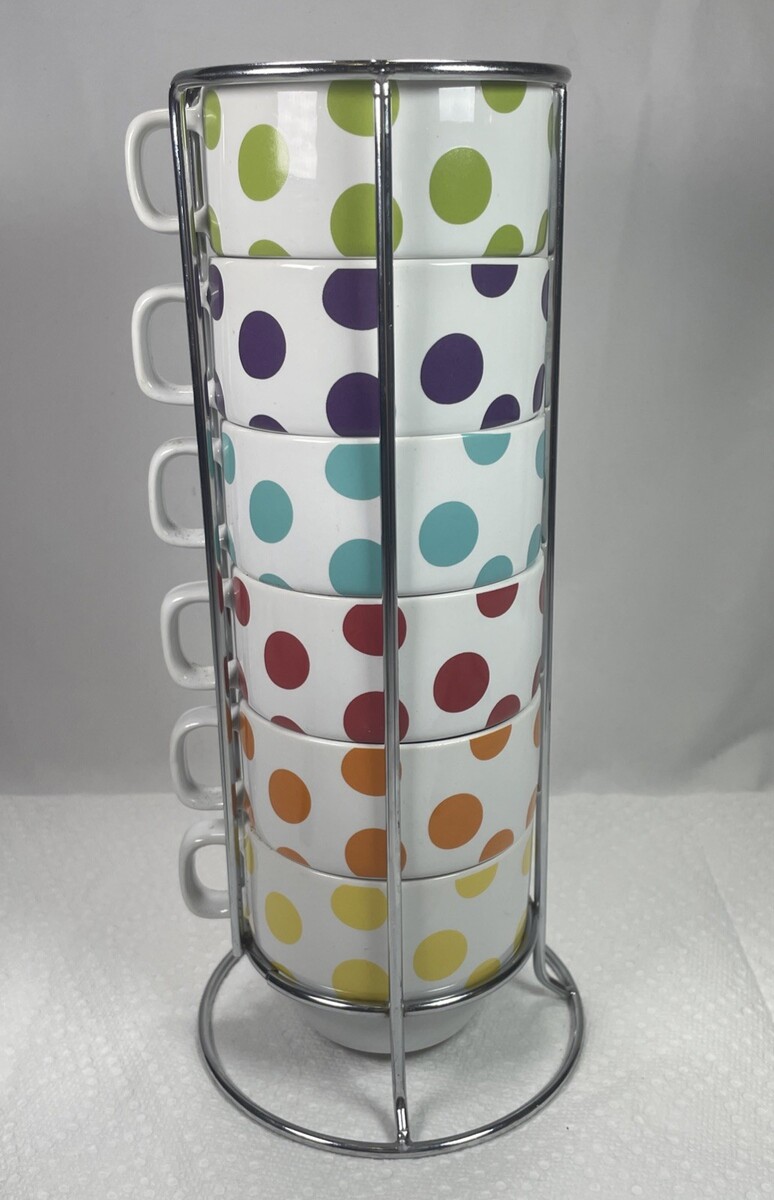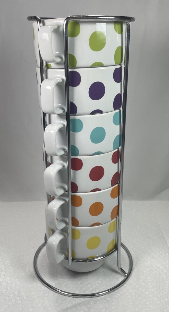 World Market Rainbow Polka Dot Stacked Coffee Tea Cups Metal Rack 8oz Set of 6
