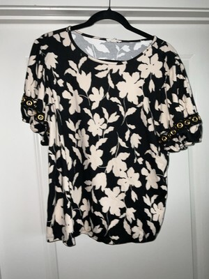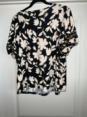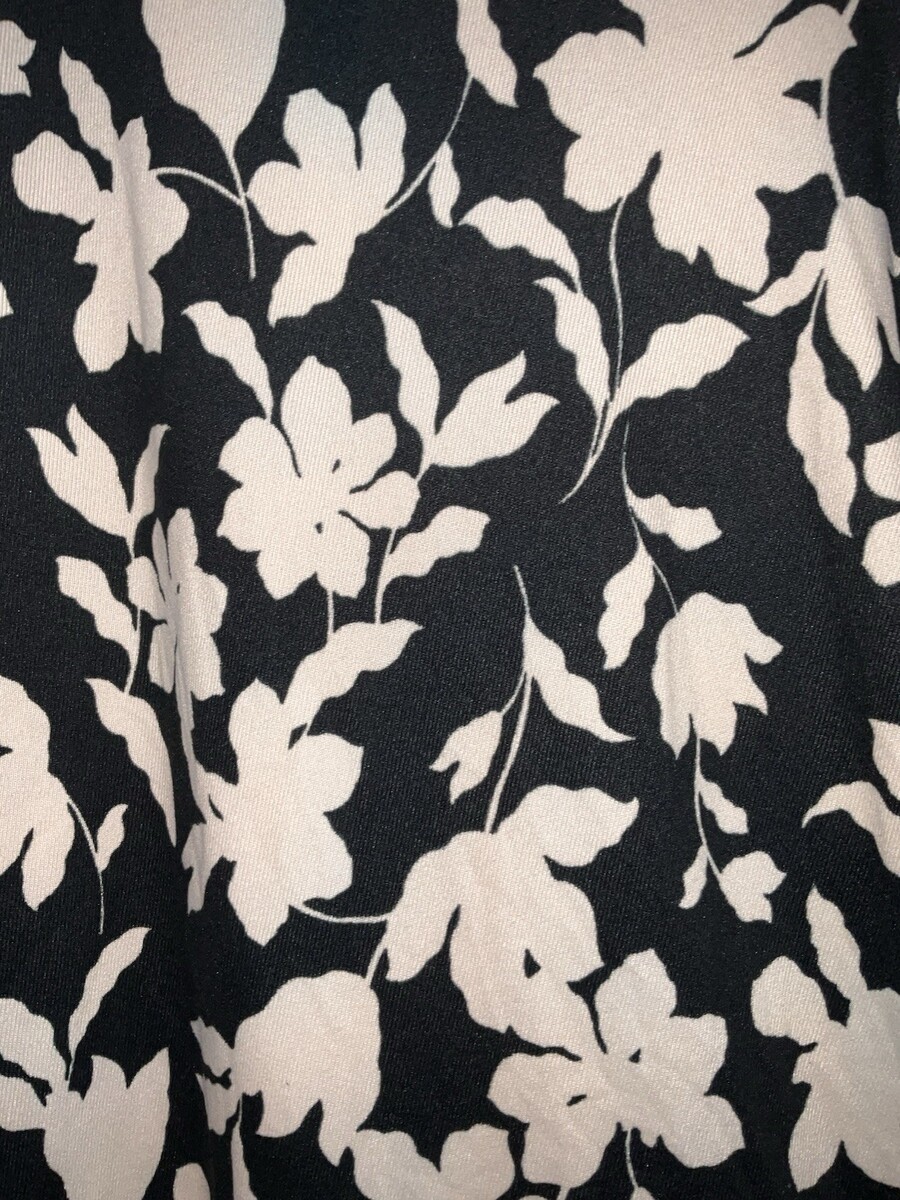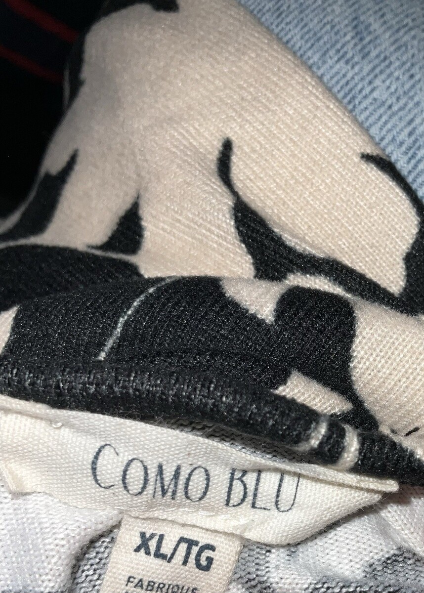 The COMO BLU Blouse in women's size XL features a floral pattern in black and tan colors, with long sleeves and a round neckline. Made from a blend of polyester and cotton, this lightweight blouse is suitable for various occasions such as travel, parties, casual outings, and business meetings. The regular fit and basic style make it a versatile piece for the summer, fall, and spring seasons, adding a classic touch to your wardrobe. Made in China under the brand Como, this blouse is a stylish choice for any woman. Pit to pit-21 1/2 inches Length -23 1/2