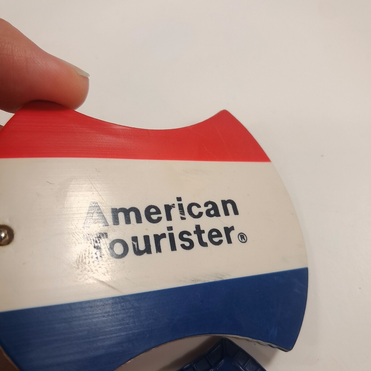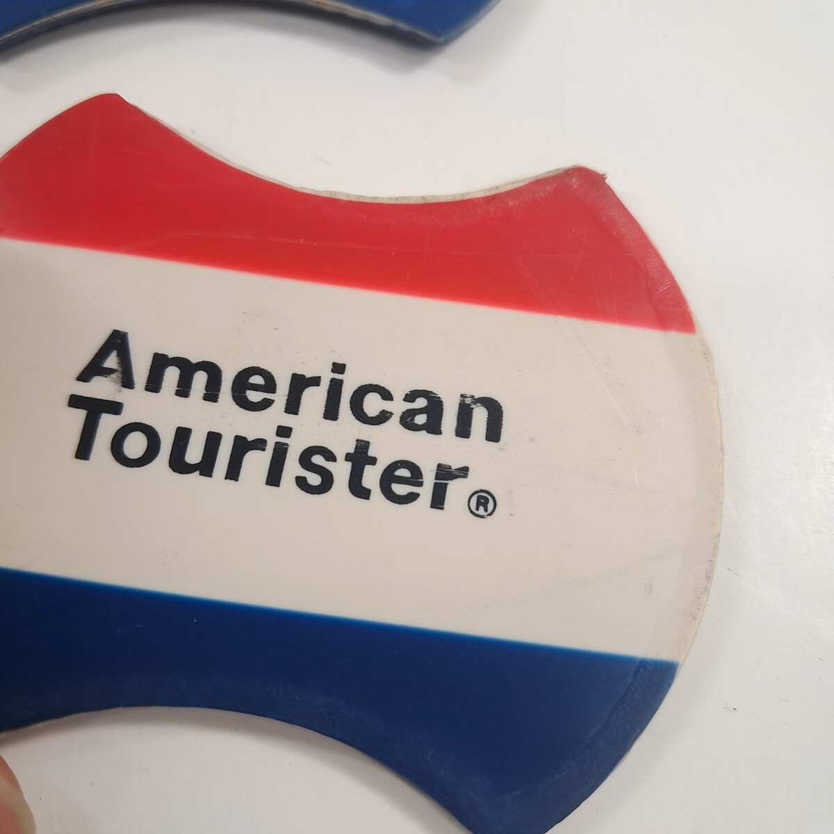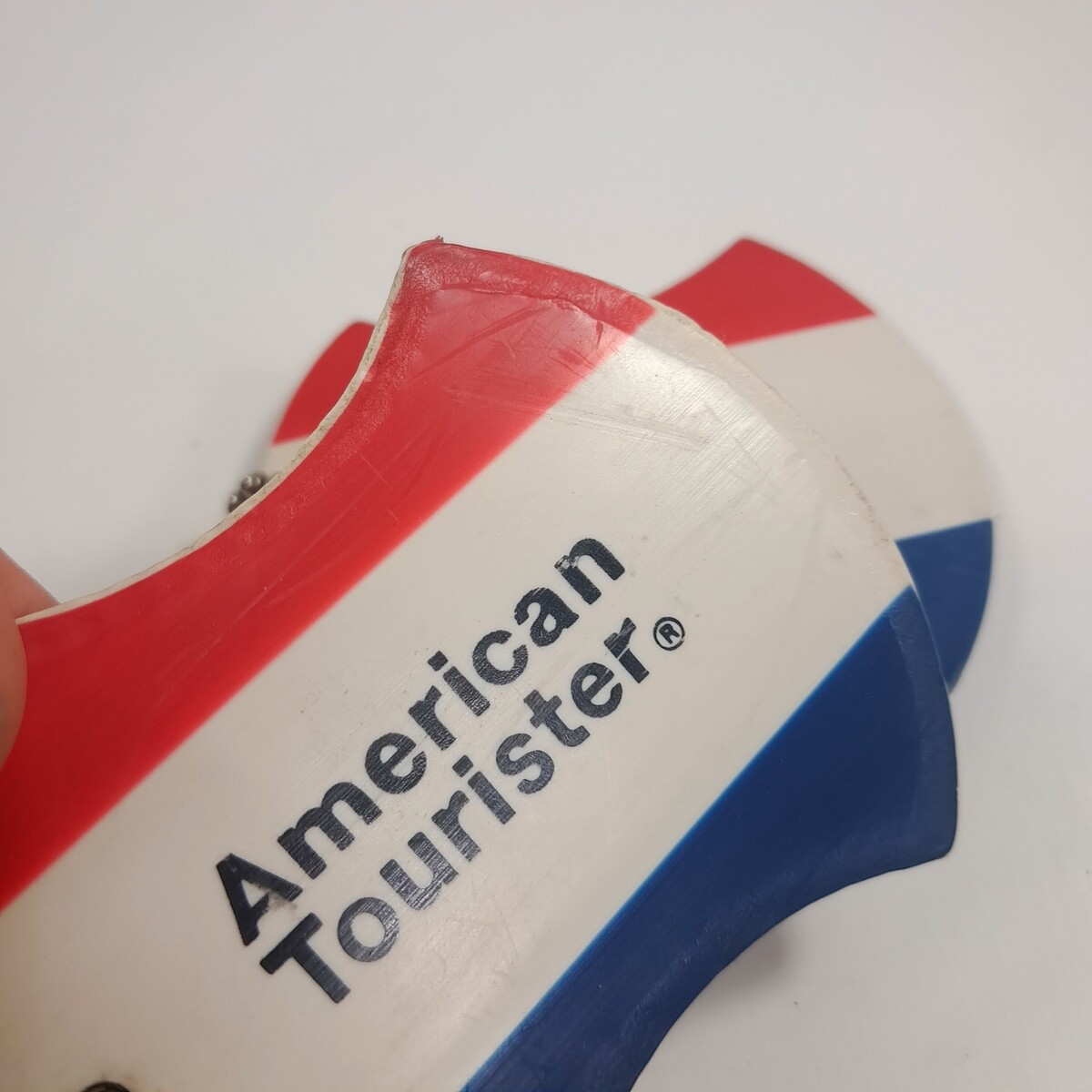 American Tourister luggage tag set 2 plastic Vintage red white blue ball chain