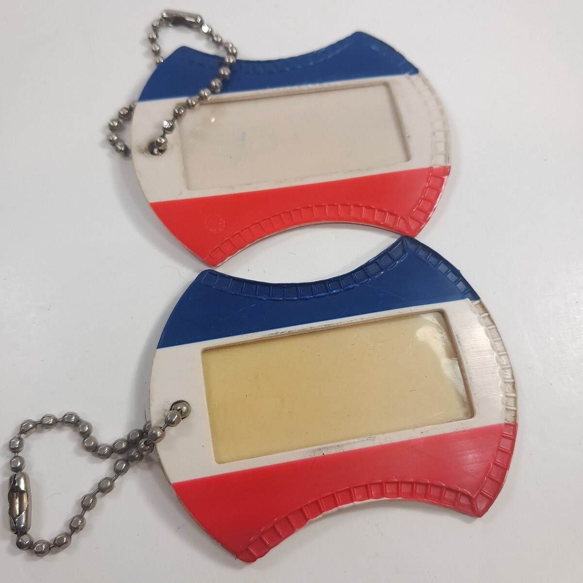 Set of 2 plastic tags. Scuffs/paint wear/yellowing to the window plastic as shown.