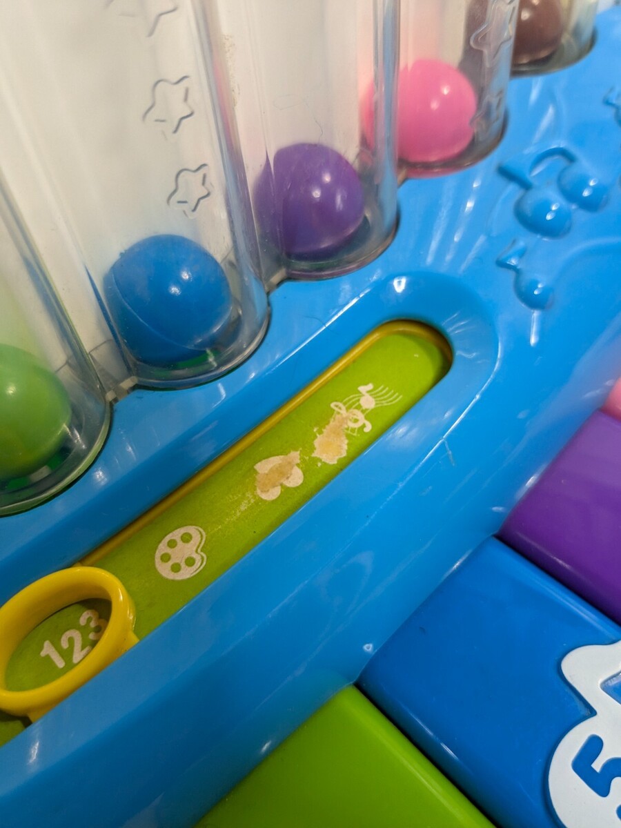Some minor paint wear/sticker wear/scuffs/scratches from use. Rainbow colored piano with balls that pop up when the keys/buttons are pressed. See pics for details measurements. Works great!