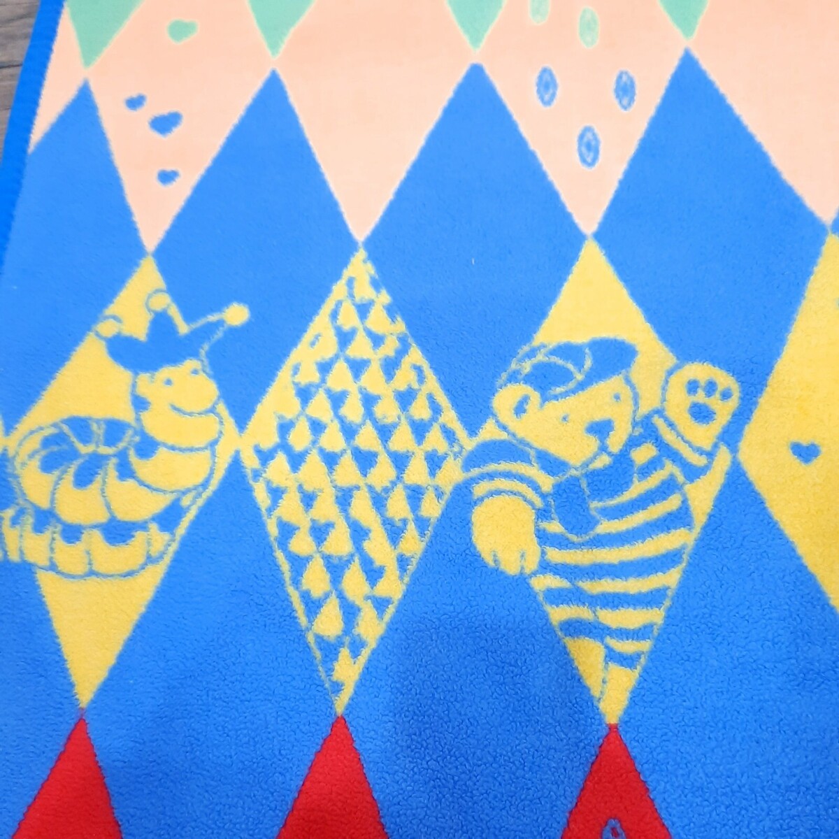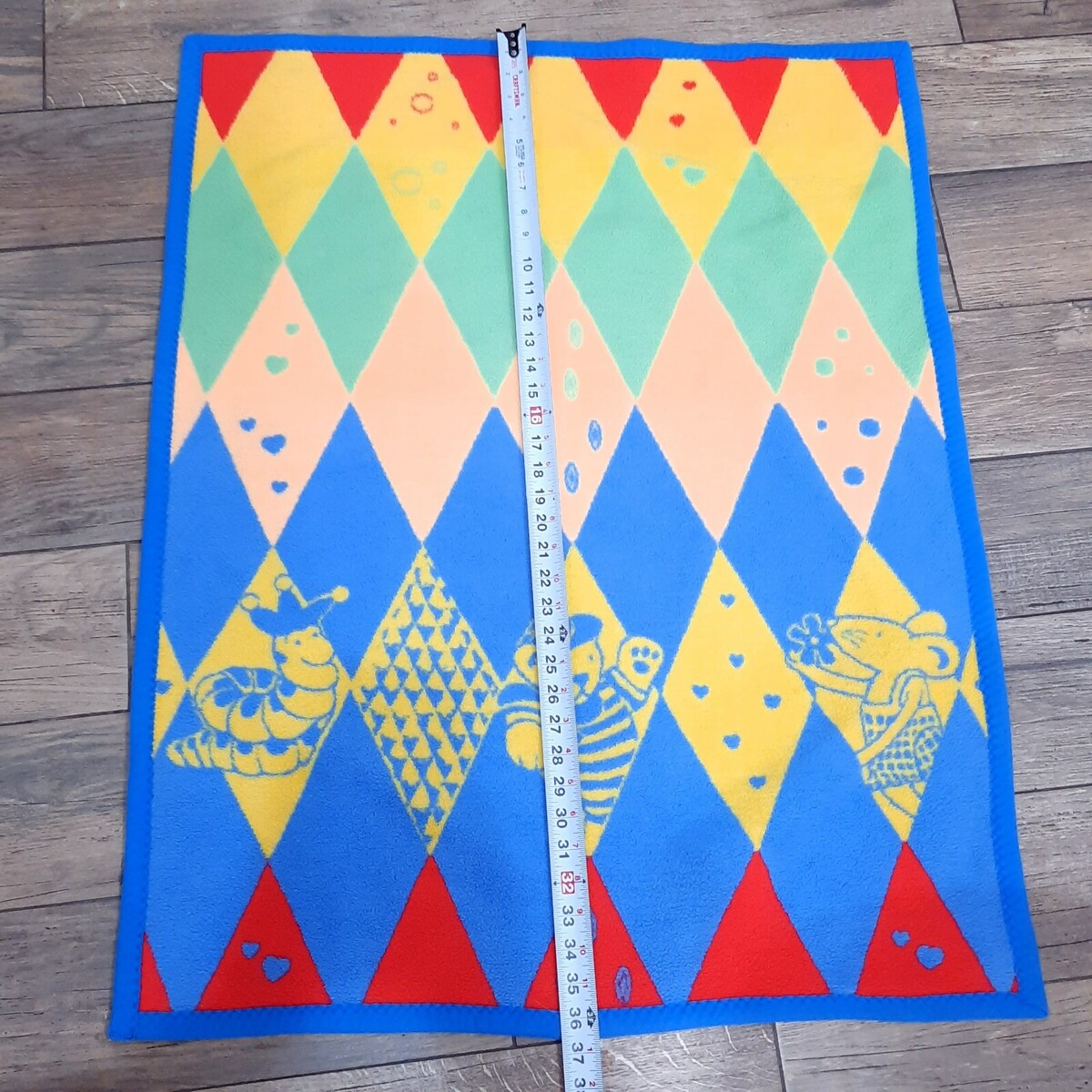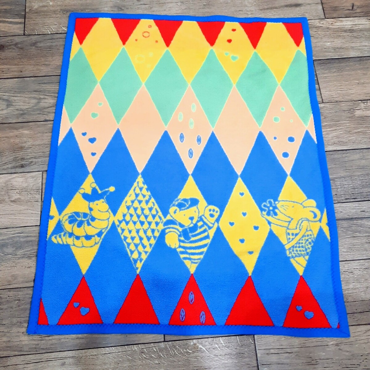 Cotton/Acrylic blend baby blanket. Diamond print with caterpillar, bear and mouse with red, blue, yellow and green colors. Made in Germany. Very good condition. Most likely from the 80s or 90s.