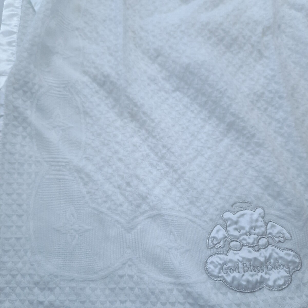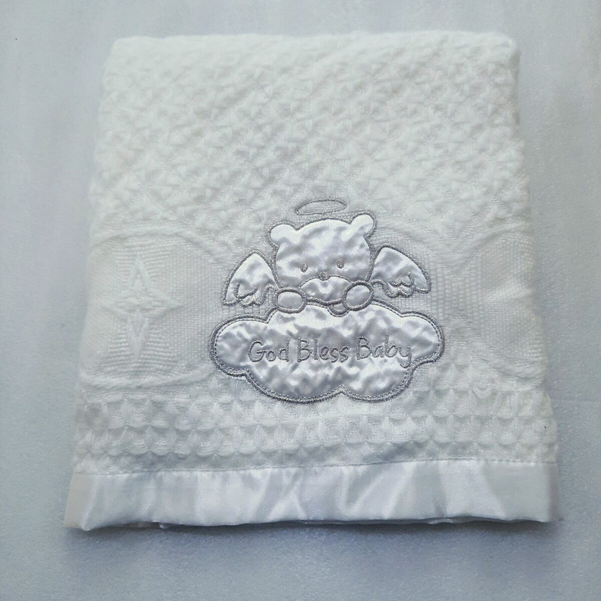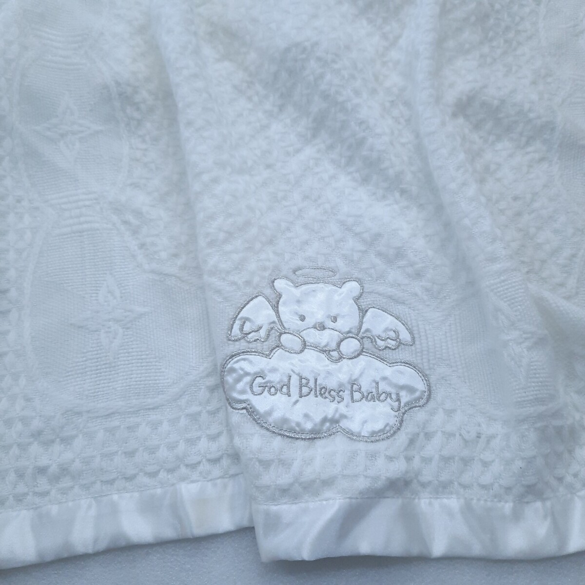 Baby Starters God Bless Baby blanket satin trim white teddy bear angel acrylic