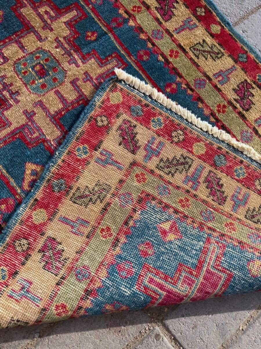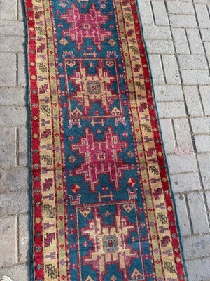 A Bold Statement in Tribal WeavingIntroduce a bold splash of color and tribal artistry with this exquisite handmade vintage Caucasian Kazak runner. Dating from the 1950s, this piece represents the enduring appeal of traditional Caucasian weaving, offering both historical significance and vibrant design that commands attention in any interior space. Dynamic Geometric Medallion DesignThe runner features a captivating series of geometric medallions in striking fuchsia pink and deep red, creating a rhythmic pattern along its length. These bold forms are set against a luminous teal and turquoise blue background, demonstrating the confident color combinations that distinguish authentic Kazak weaving from other Caucasian traditions. Vibrant Contrasting Color PaletteThe dramatic interplay between warm and cool tones creates a visually arresting effect throughout the runner. The luminous teal field provides the perfect canvas for the vibrant fuchsia and red medallions, while the wide golden beige border frames the composition with warm, earthy balance. Olive green accents add depth and complexity to the overall color scheme. Exceptional Hand-Knotted ConstructionWoven from high-quality sheep's wool using traditional hand-knotting techniques, this runner showcases the technical skill of Caucasian weavers. The wool retains a soft yet durable texture, while the traditional flat-woven edges and well-preserved fringes demonstrate the careful attention to detail that characterizes quality Kazak textiles. Perfect Runner ProportionsMeasuring 2.4 feet by 9.9 feet, this long, narrow format is ideally proportioned for high-traffic areas. Use it to enliven hallways and corridors, create a striking bedside pathway, or define the length of a dining table. Its substantial presence transforms functional spaces into galleries of tribal art. Key Product DetailsStyle Kazak Geometric TribalPeriod Mid-20th Century, circa 1950sOrigin Caucasus RegionCondition Good Vintage ConditionMaterial Hand-Knotted WoolDimensions 2 ft 5 in x 9 ft 11 inDimensions (Metric) 73 cm x 302 cmPrimary Colors Teal/Turquoise, Fuchsia Pink, Red, Golden Beige