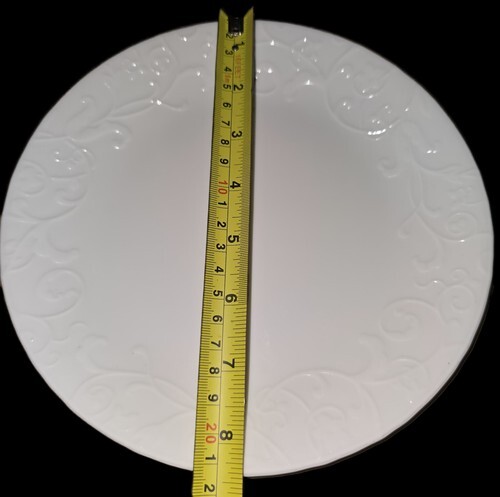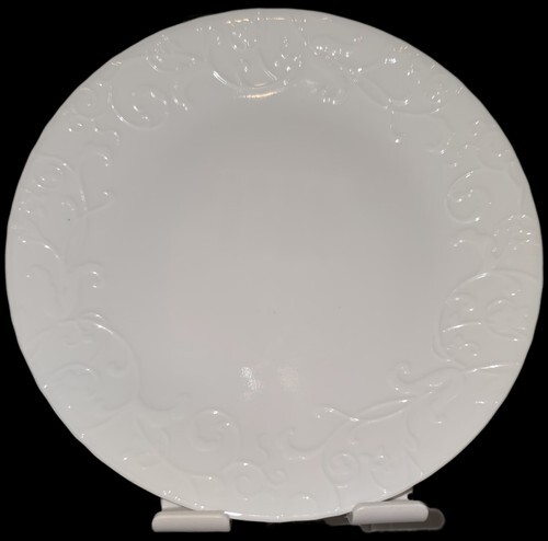 Enhance your dining experience with this elegant set of 4 Corelle Bella Faenza white raised pattern lunch salad plates. Each plate measures 8.5 inches in diameter, perfectly sized for your favorite salads or appetizers. Crafted from durable Vitrelle glass, these plates are designed to last with a glossy finish that's as beautiful as it is functional.