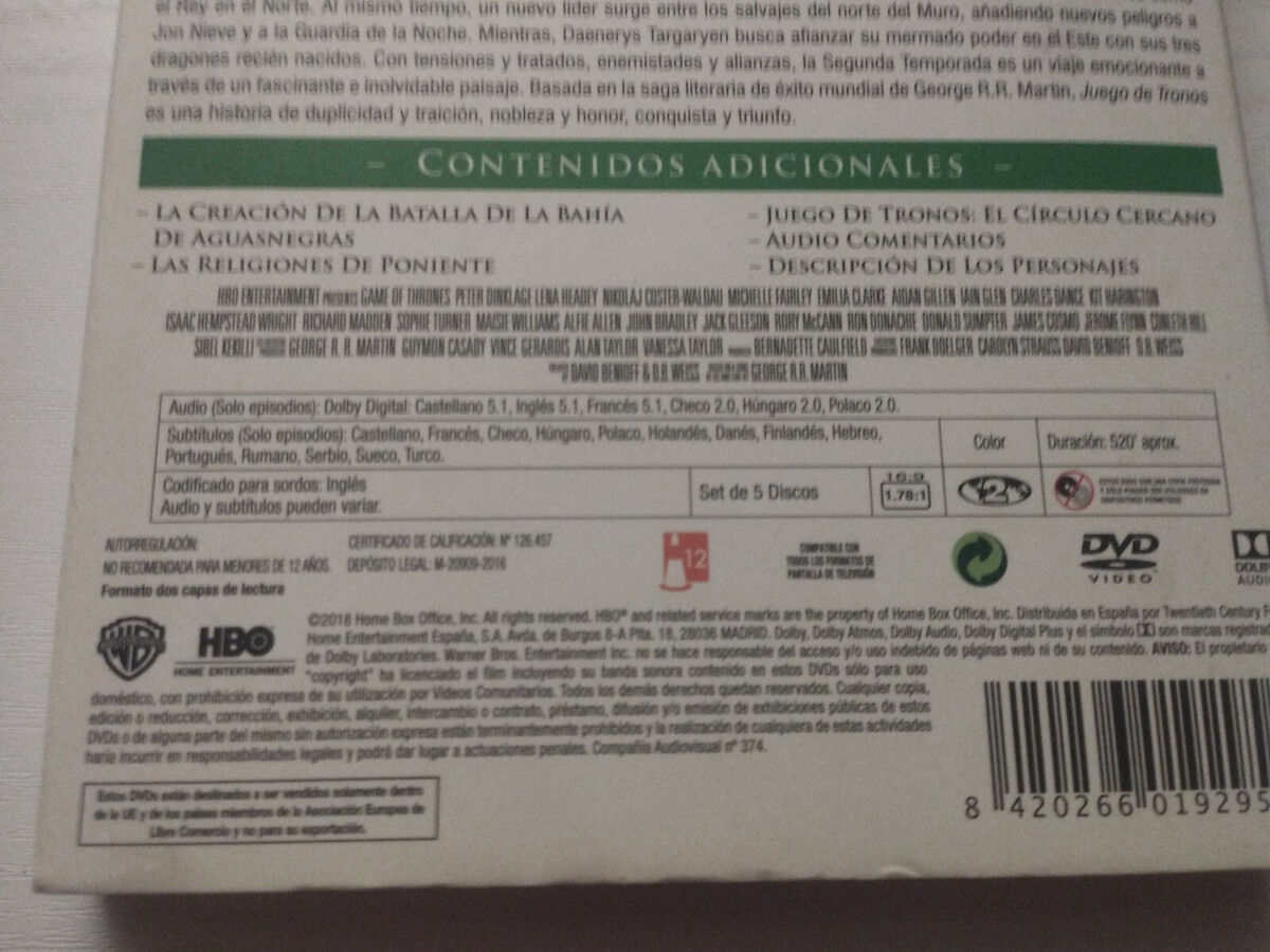 Game of Thrones Second Complete Season HBO 2018 DVD Spanish English Reg 2 Am