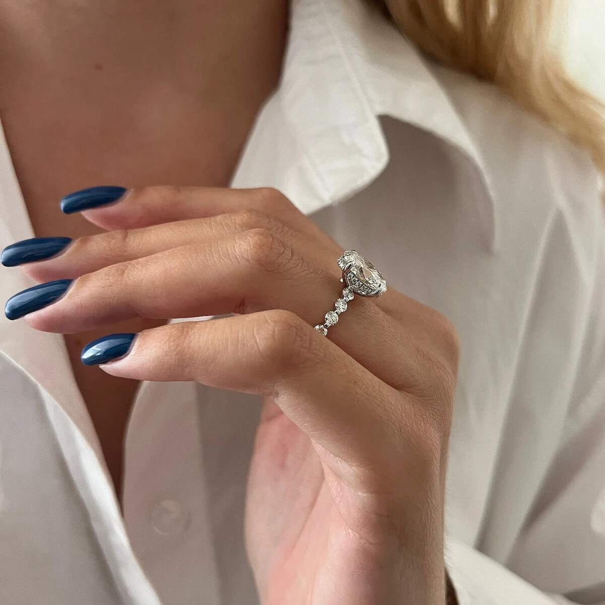 Celebrate love with enduring brilliance. This 3 Carat Oval Lab Grown Diamond Ring is a stunning fusion of elegance and sustainable luxury. The center diamond, boasting a remarkable F+ color and VS1+ clarity, is flanked by 0.85 carats of round brilliant lab grown diamonds, creating a sparkling cascade of fire and beauty.
