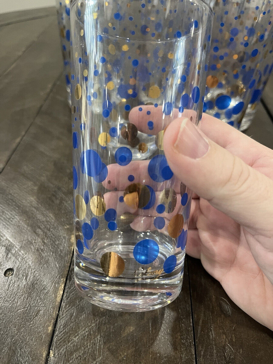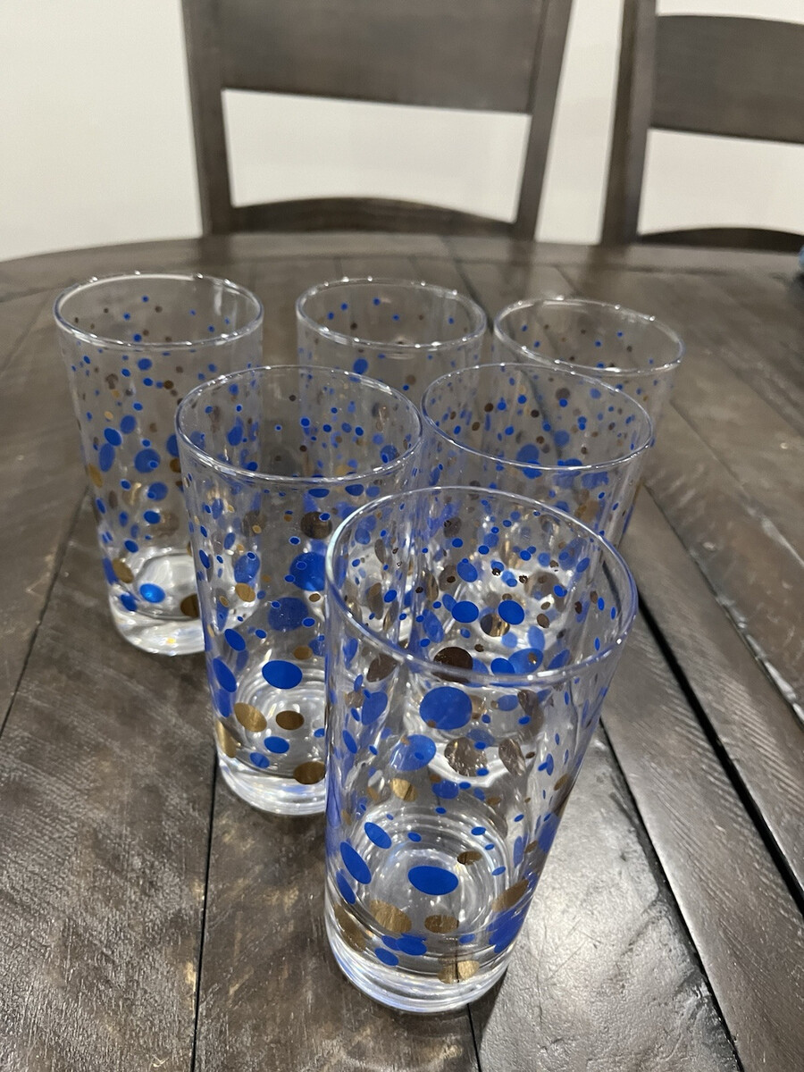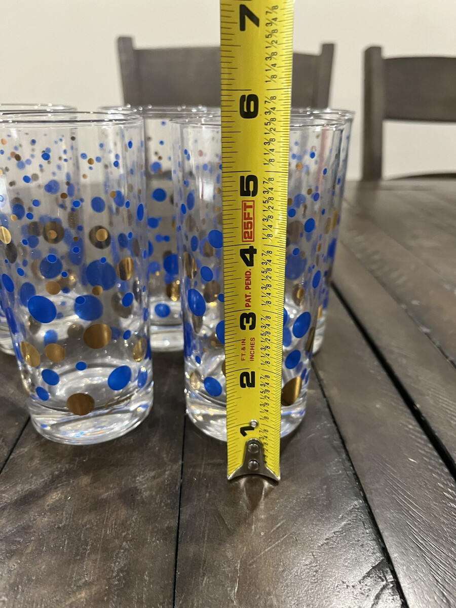 Colony Glassware High-ball Polka Dot Blue Gold Tumbler Barware MCM Vtg Set Of 6