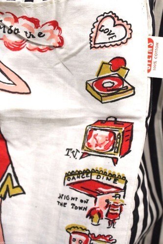 Sweet Silins Brand apron still has the paper label on it. Crisp 100% cotton apron has adorable pockets with a gal trying to consider her options for a Saturday night.