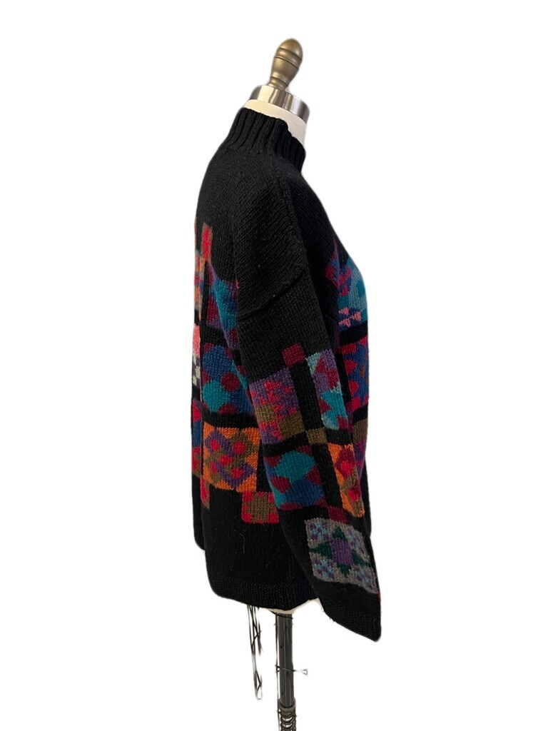 VTG 80s LL Bean Wool Sweater M Black Colorful Quilt Block Folk Art Boho Cozy